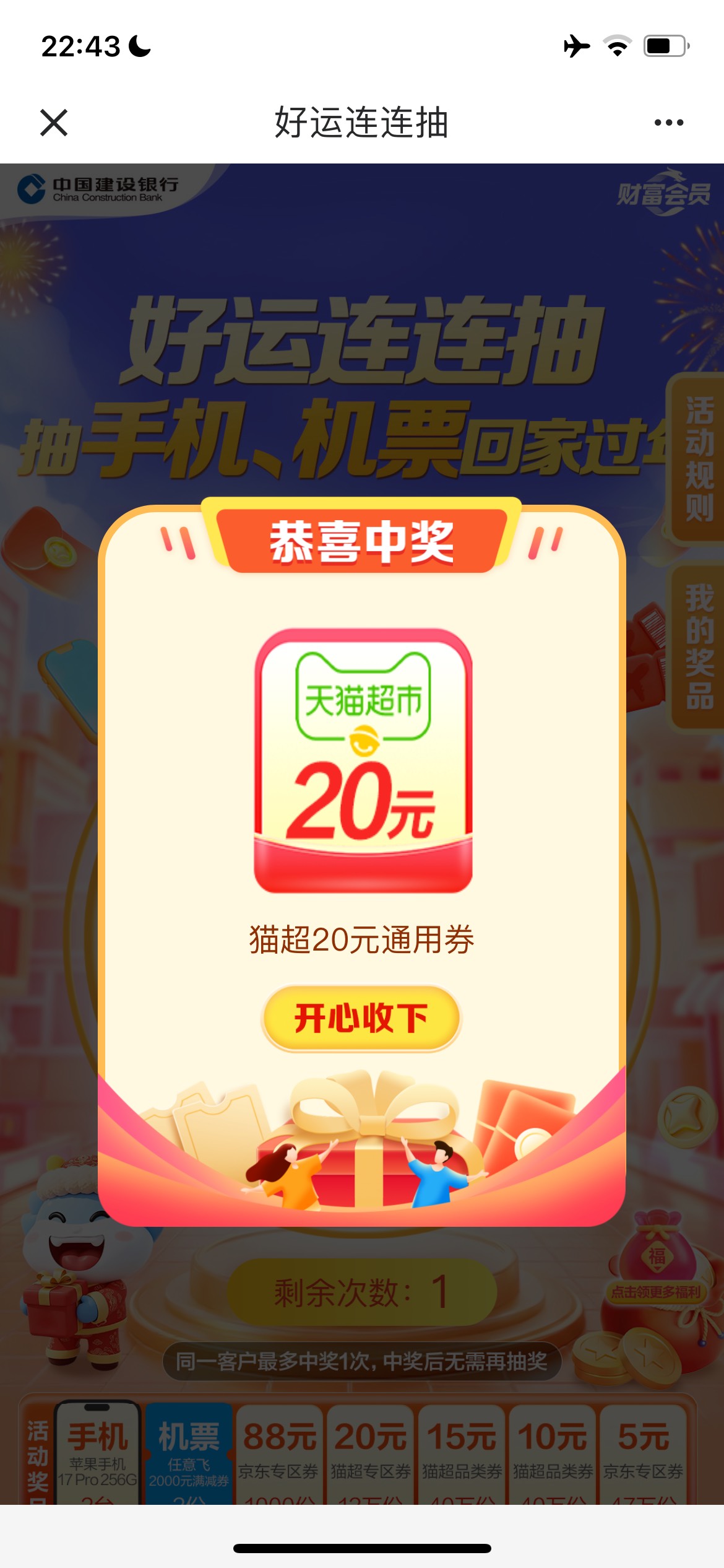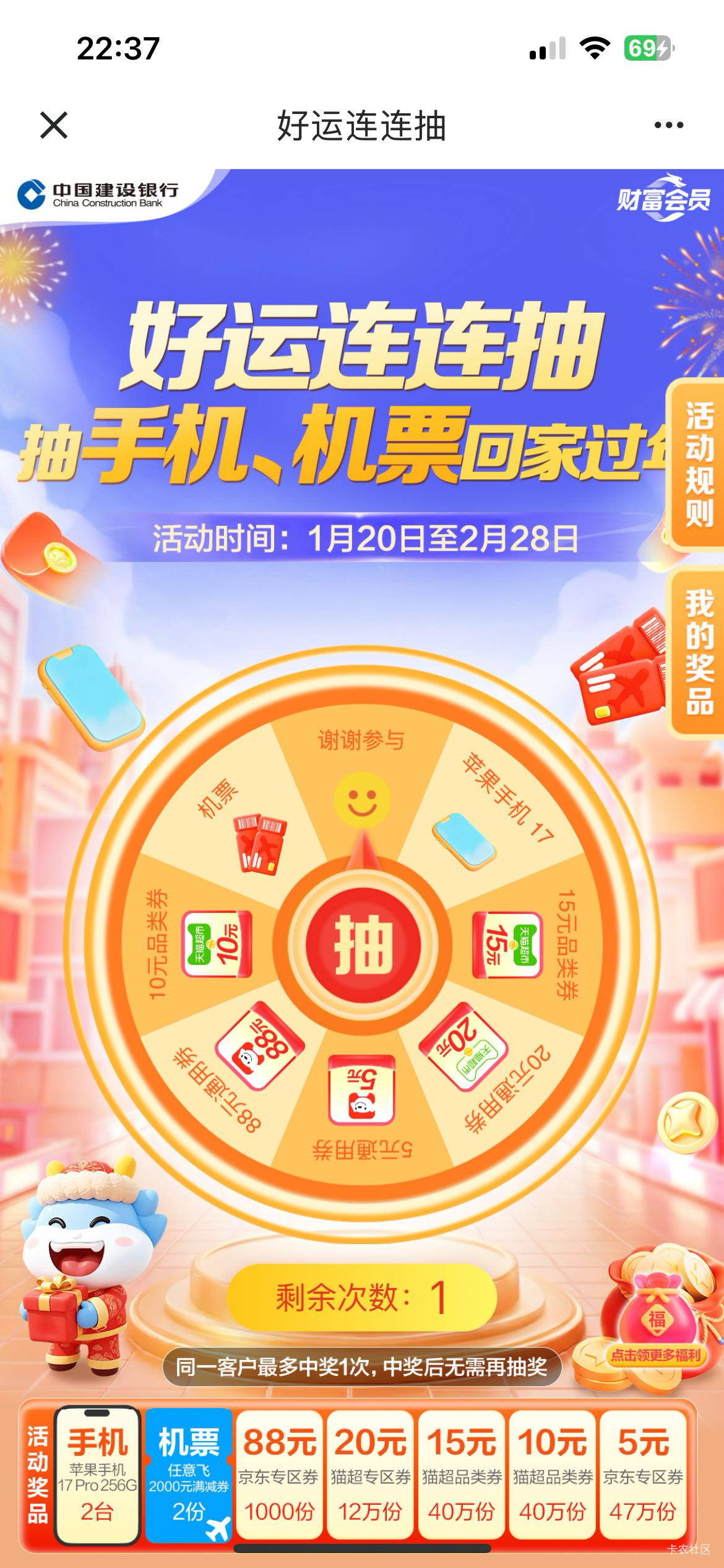 建行好运连连抽手机机票回家过年活动
