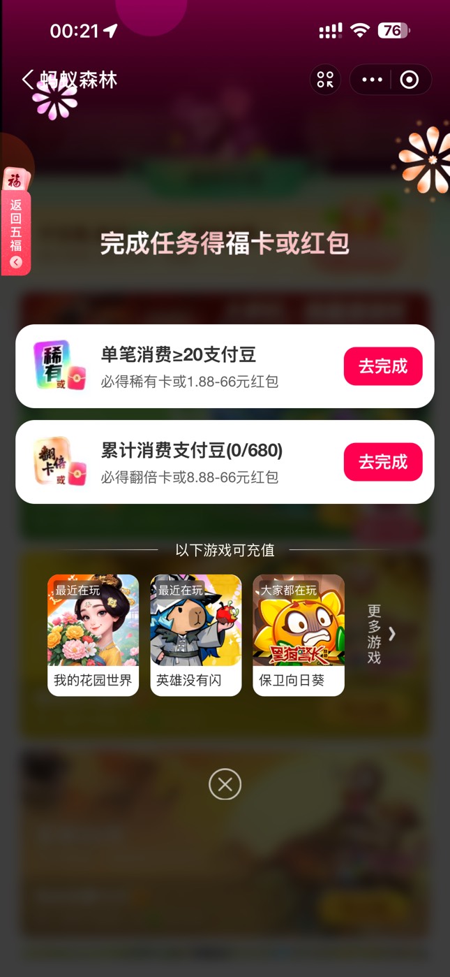 哭了 支付宝集齐五六天了 一张翻倍卡都没有 刚才刷出来了充值活动结果要充680