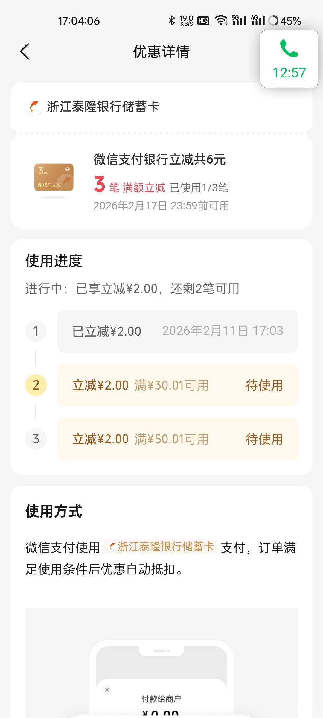 微信摇一摇泰隆银行微信支付多笔立减活动