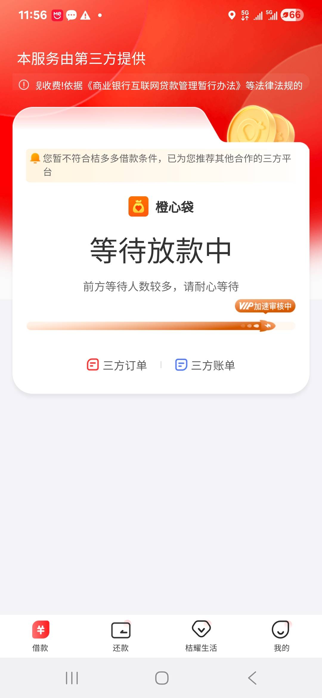 橙心袋第二笔两天了。还没到账。今天凌晨开了会员,支付了56。难道要等13号第一笔还款