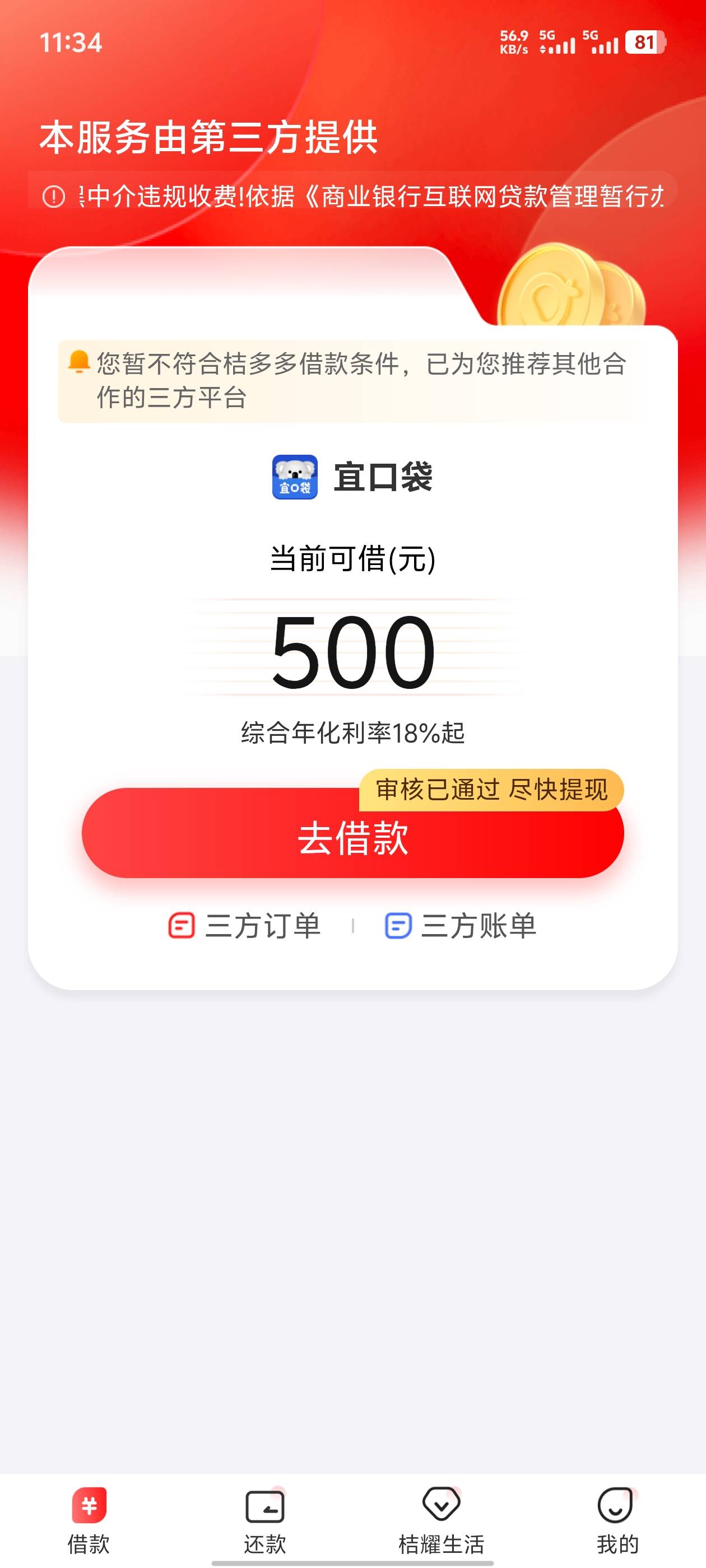 宜口袋和橙心袋和下一笔500当时没扣到会员费,昨天橙心袋又能借款自费56凌晨没给我放