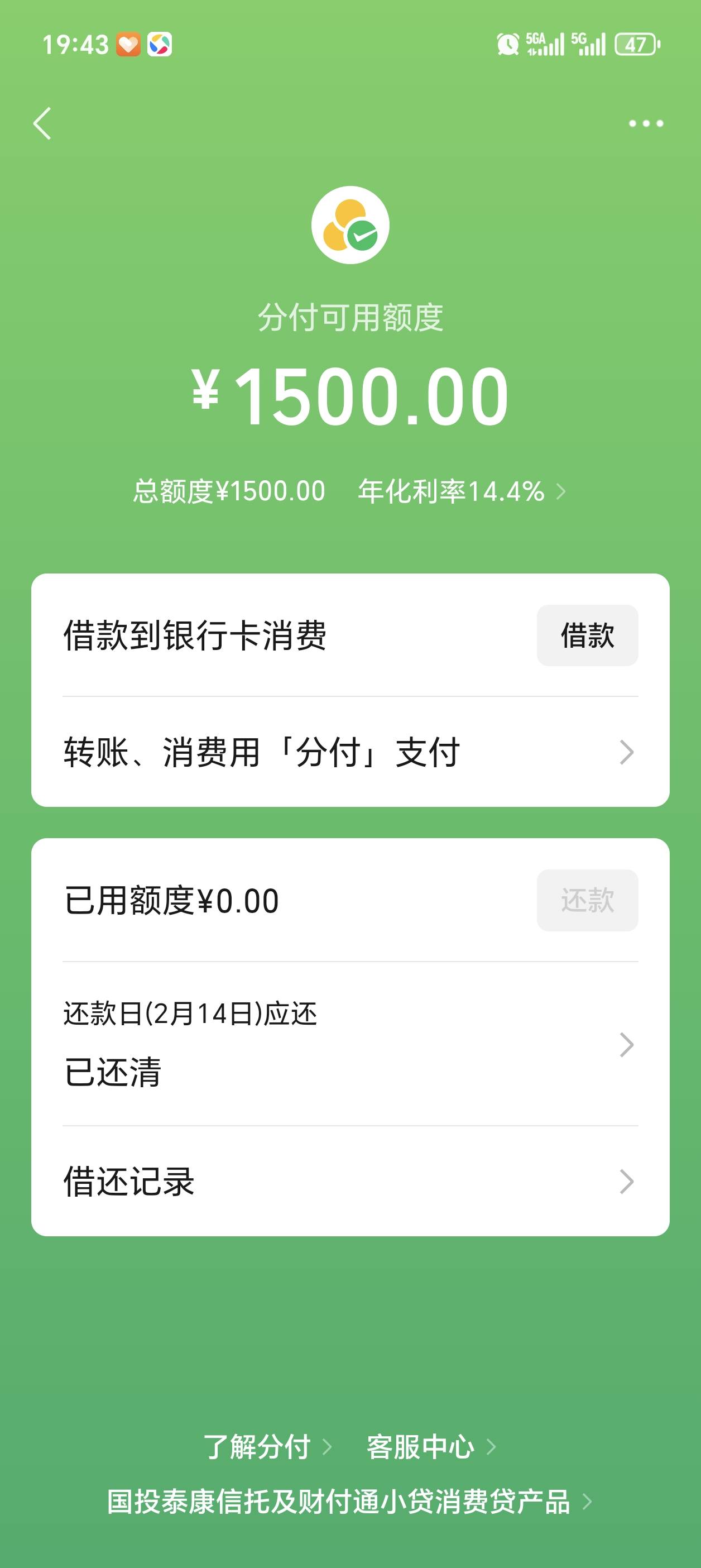 还是分付稳不T路,直接借卡里,就是额度有点低1500