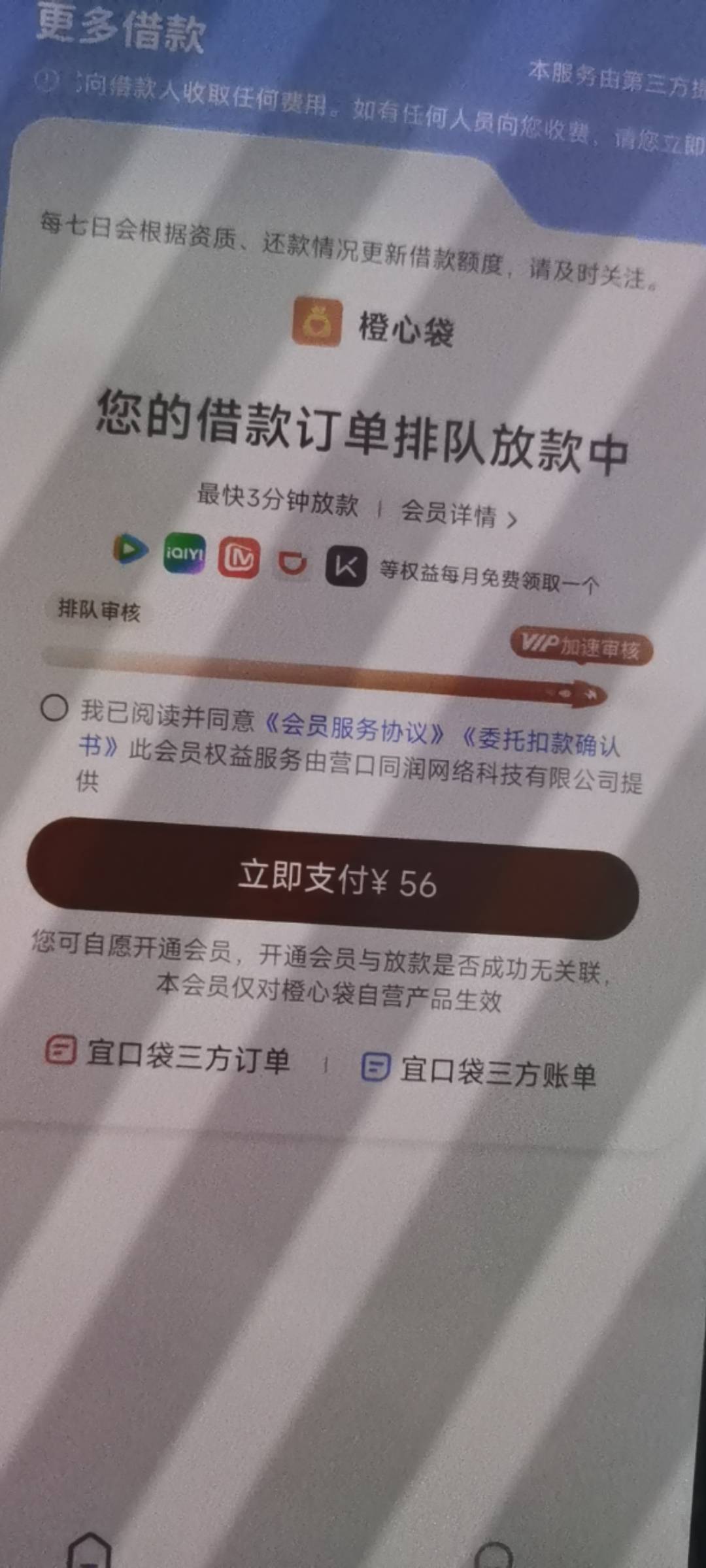 宜口袋,不支付会放款吗,马上到了还款日,现在显示放款中,让支付56上个56他没扣走,如果我付了就是两个56都能退吗