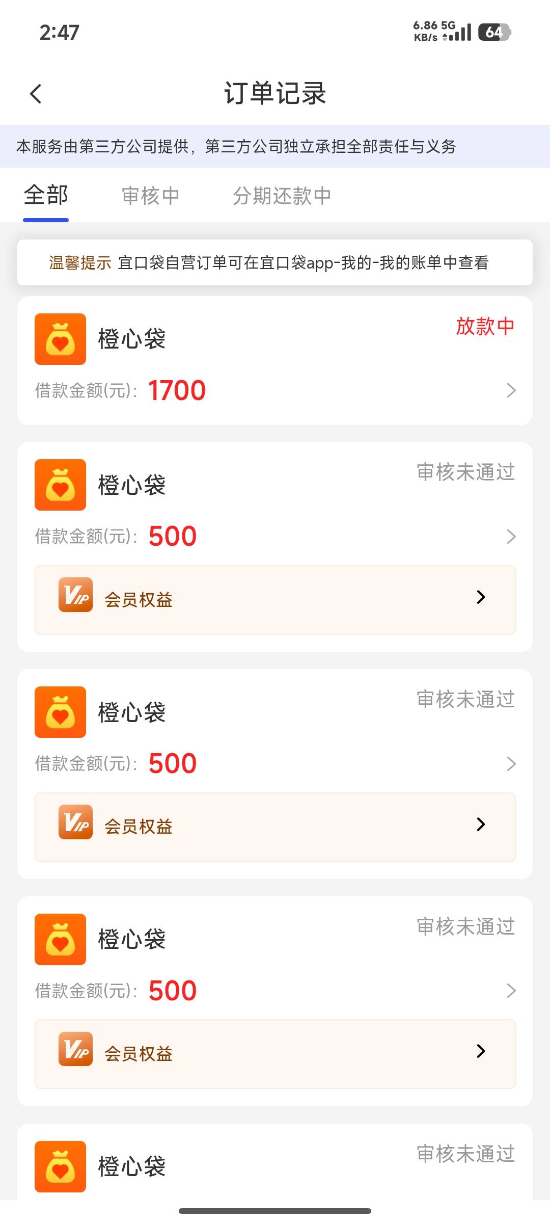有个奇怪的事啊,我9号的时候橙心袋1000额度开会员先用后付4000额度,后面自动改订单下了500,扣了会员56,额度还剩500开会员是3500,然后后面几天几乎天天都申请 虽然隔一会都会变成500,但是最后都审核不通过,今天突然隔一会变成1700,点确认改变就变成放款中,会员也取消了 也没开会员的入口 咋回事,第二个图那个会员到期时间是第一次下500那个时间,起先没变1700之前,到期时间是2027年2月份,现在会员也取消了,