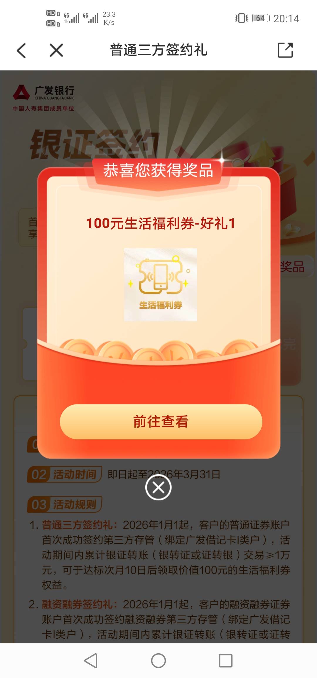 广发三方没想到可以领了,前几天领不了以为去年领过58了不是首次领不了,去年底三方解绑了一季度重新报名的