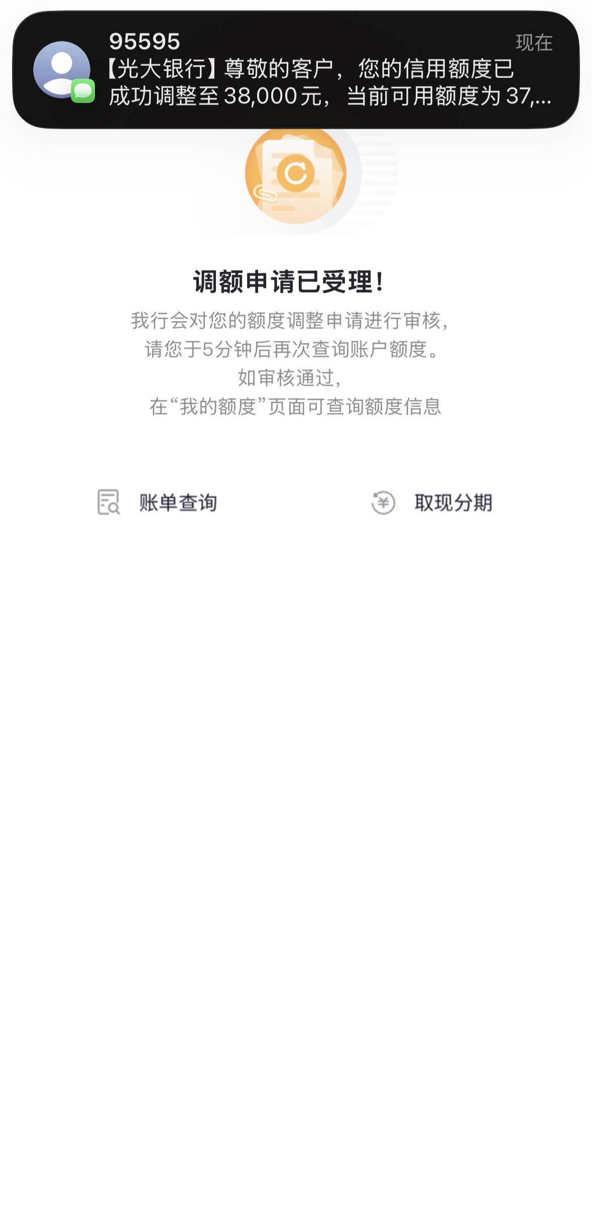 光大银行下卡三个月翻倍提升额度,蚂蚁宝藏卡,去年11月份下的卡。今天一看可以提升额度了,果断点击,一分钟短信提示成功了!虽然但是只有双倍没有大家的五倍那么历害。