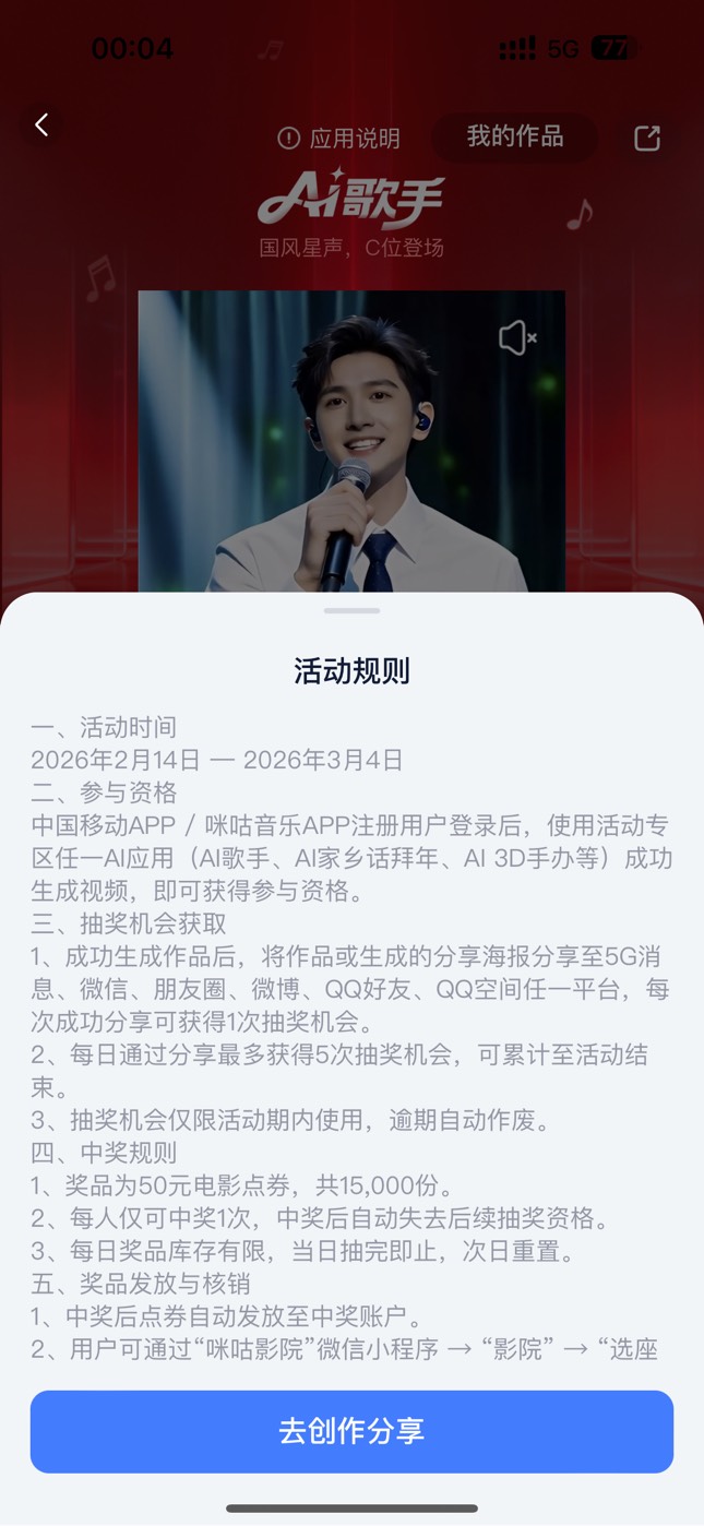 咪咕音乐制作分享AI视频抽电影券活动