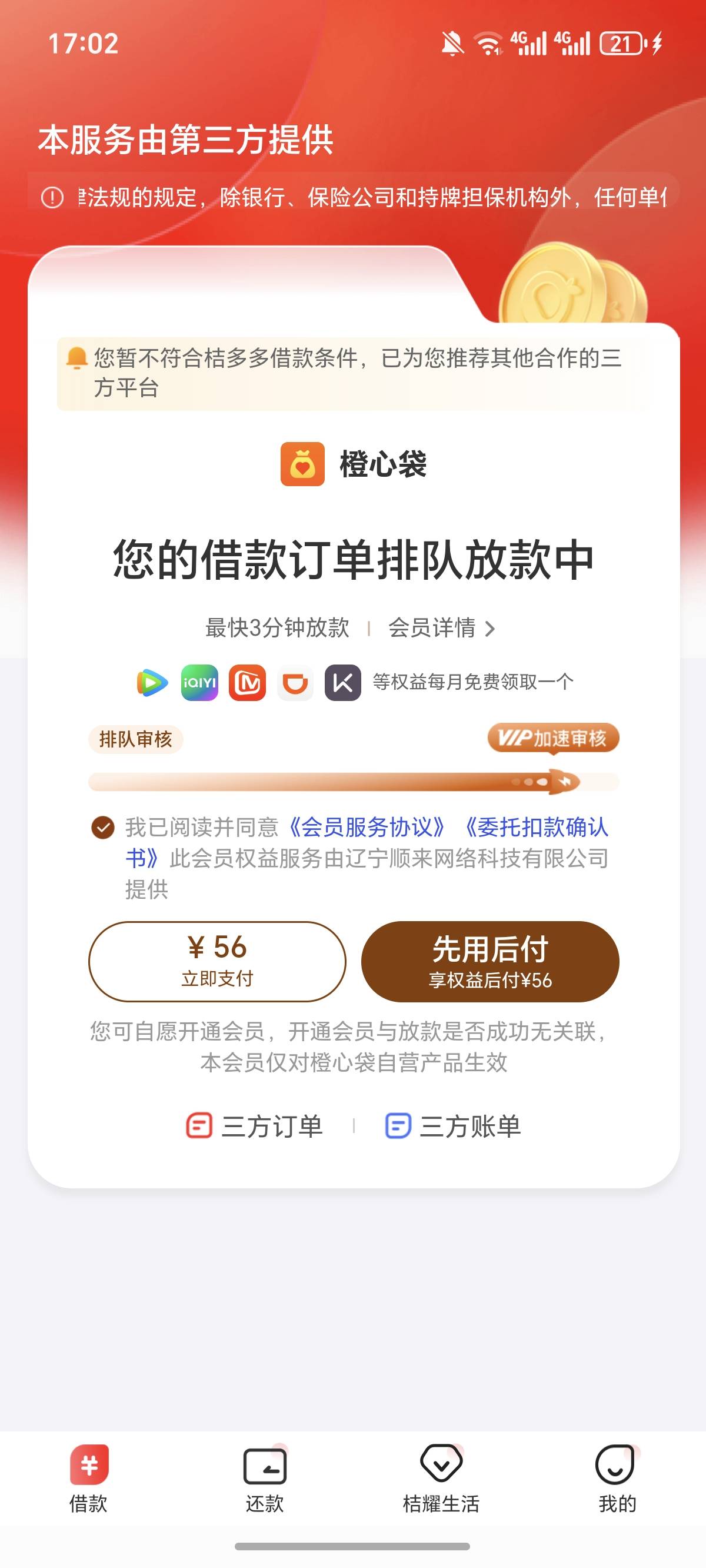 能下吗?第三笔,中午,jdd申请的显示审核中,等待放款中,但是橙心贷app上面直接显示的是未通过,额度500恢复了,但是jdd还是显示的审核中,后面我在去看 出了要付会员的页面,请问一下这个还能下吗?现在还是在显示放款中。开通了先用后付,我下午