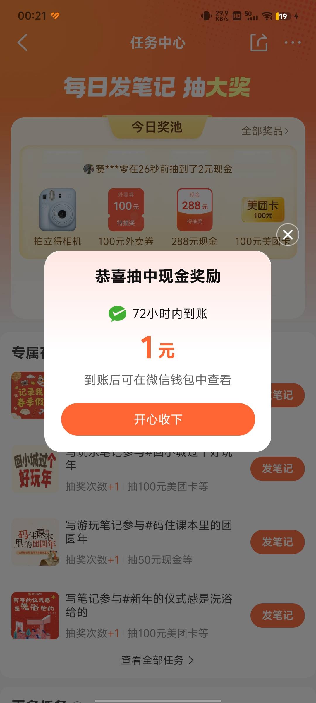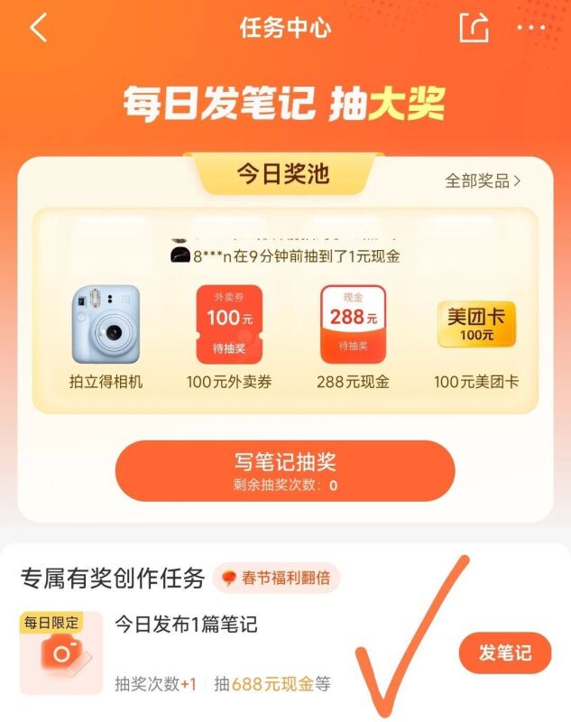 大众点评搜:任务中心页面有这个发笔记的 抽 1 亓现jin发一篇过5-10分钟就能抽了