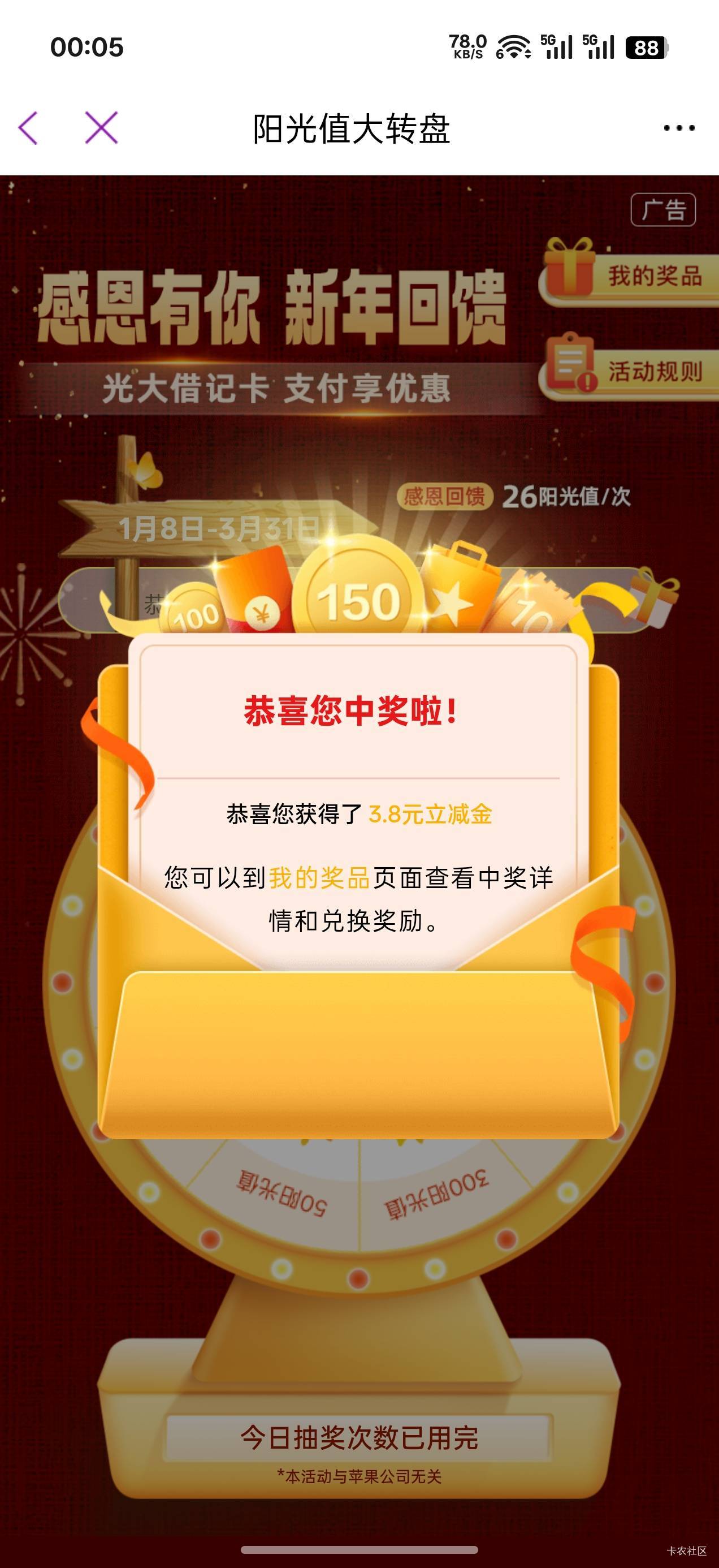 光大抽中了88