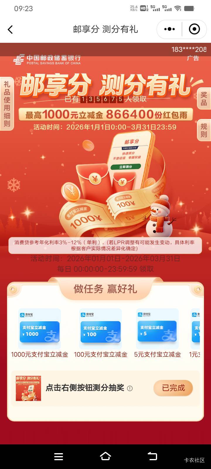 邮储银行活动专区邮享分测分有礼活动