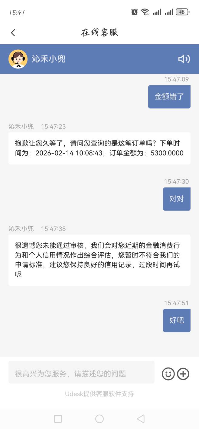问了几次客服可算跟我说实话了。之前一直说让我过几天再申请试试。怎么怎么样。刚刚总算说是我没通过审核了。