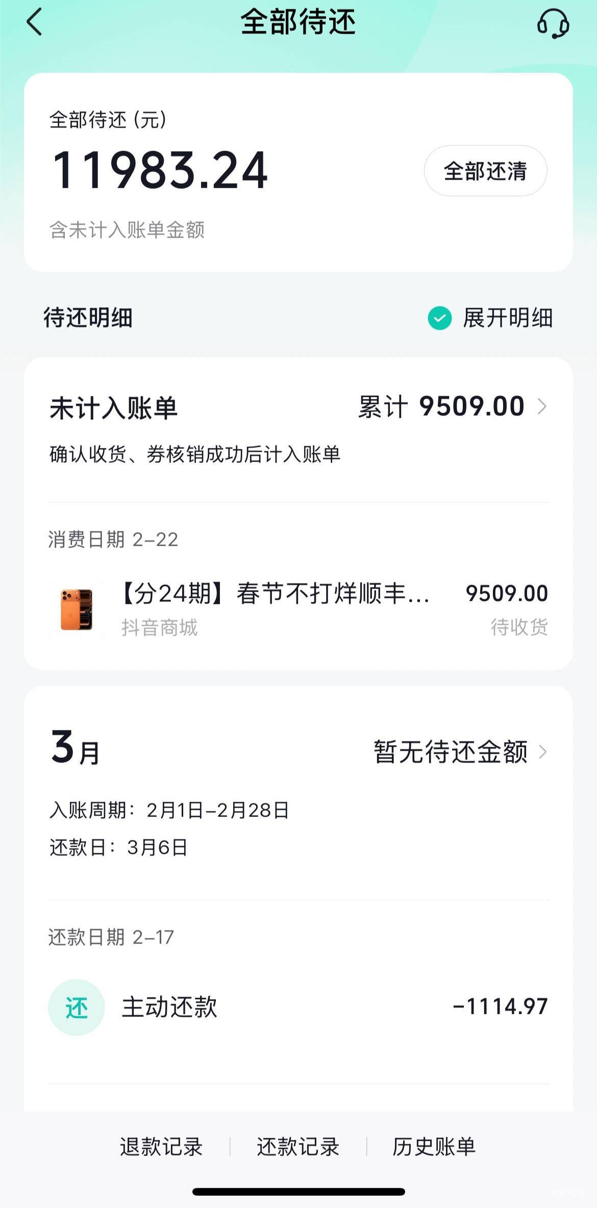 月付下了,啥也不说了,10月份以后一毛钱没下来过,资质是大花,月付额度万年1k,去年4月份卡了个苹果16pm,到今年还有二个月还清,这二天一直在观察苹果17pm,一直都是订单不支持,但是前天开始我点进去看有临时额度提升,犹豫了退出来看了别的17pm然后直接风控点啥都是订单不支持,然后想着购物点东西在抖音刷一下这个活跃度,然后临时额度时隔三天终于再次出现,果断下单24免息再加国补9500。