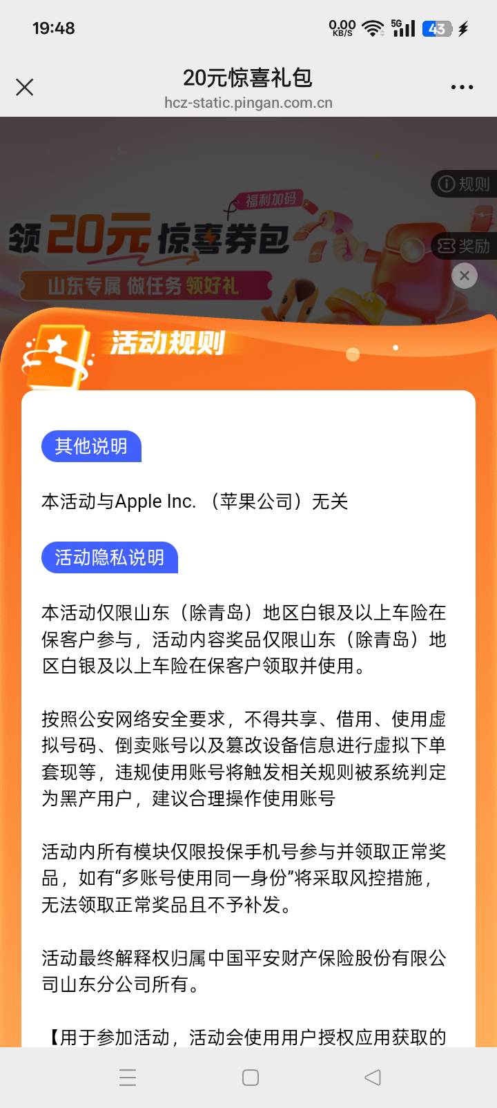 山东平安车主,领21-20电费 https://hcz-static.pingan.com.cn/activities/component-template/index.html?id=2006884288730025819&launchId=1989225997707915265&titleBar=no&allowLongClick=false&scm=ACT_HCZ_HDZX_2006884288730025819&executionId=a1za001pya00b00001a20001h3h2pcgm49sqk&requestId=null&wxwork_userid=HEZHUQING2761#/0?pmOccupy=true