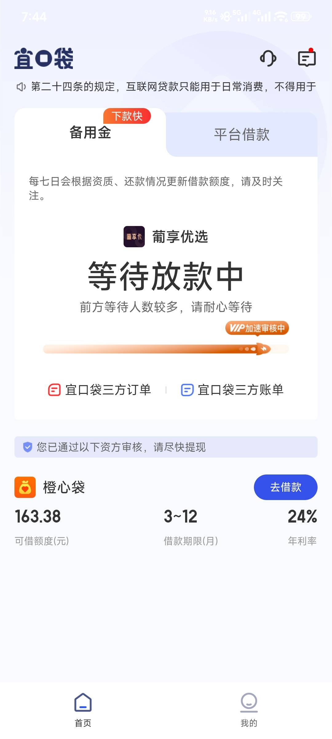 今天还款日,也是700,我还交了额56,一直放款中,三天了