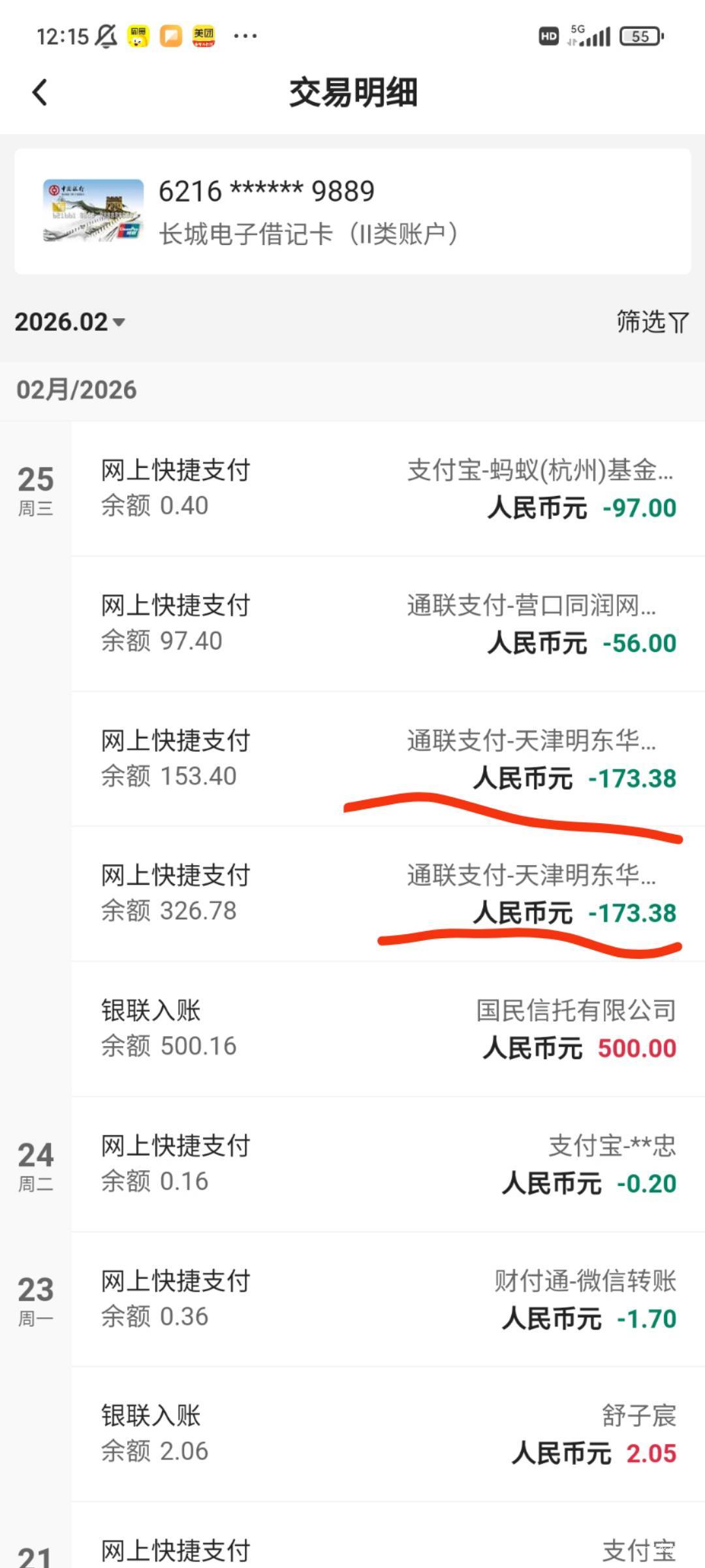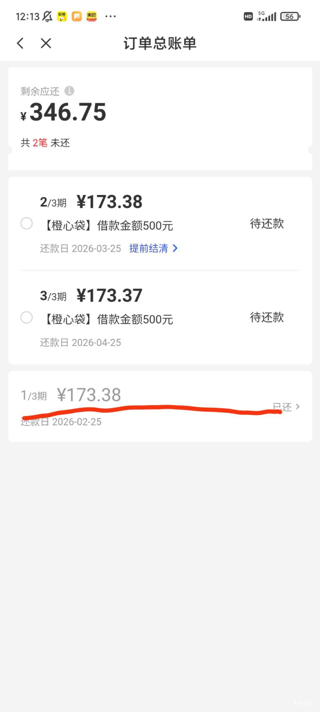 老哥们 橙心贷之前就下了一笔,今天还款日应该只扣一笔173.38 今天下了一笔 直接多扣