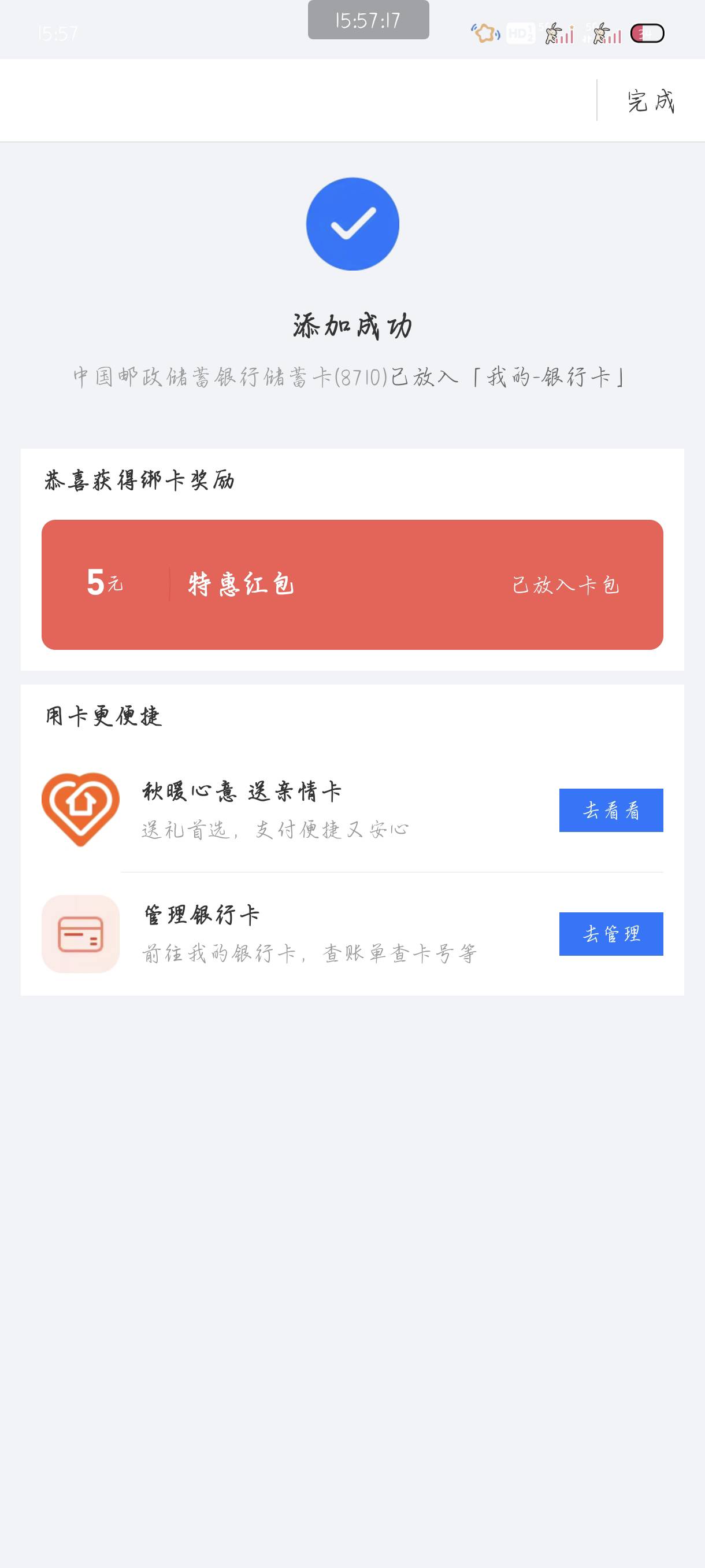 邮储绑卡得5