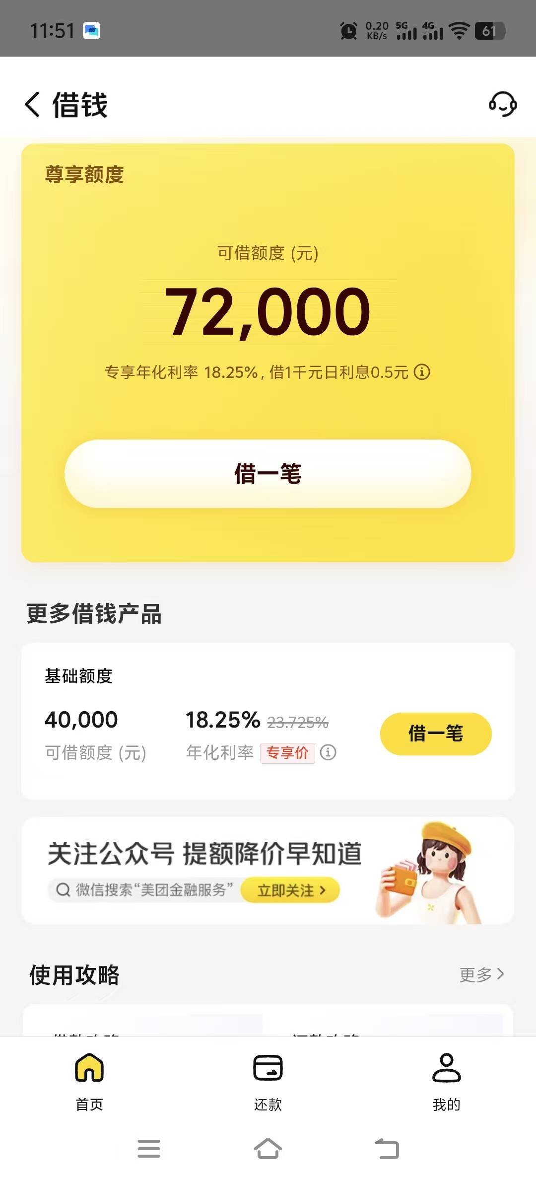 离谱他妈给离谱开门,离谱到家了,24年美团下款1.4万,25年还完后额度降到9000,然后关闭了,最近两三个月就借了6千借呗,目前再用的还有够花2.7万,还有三个月还清,这两三个月没点任何贷款,今天试了试美团,居然给了这么多,且7.2和4.0的额度应该是可以单独申请的,17年18年逾期的网贷有挺多,一点没还的记得有小黑鱼,还有万达旗下一个叫什么忘了四个字,原子贷,你我贷,现金借款,这些都是4-8k的额度,现在每天都有催收电话,最ex的是现金巴士,1000块钱每年都有催收来,以前的还是不可能还了,通讯录通话记录当时给爆的太狠了,现在债权都不知道转让了多少手了,再三个月还完够花差不多就上岸了