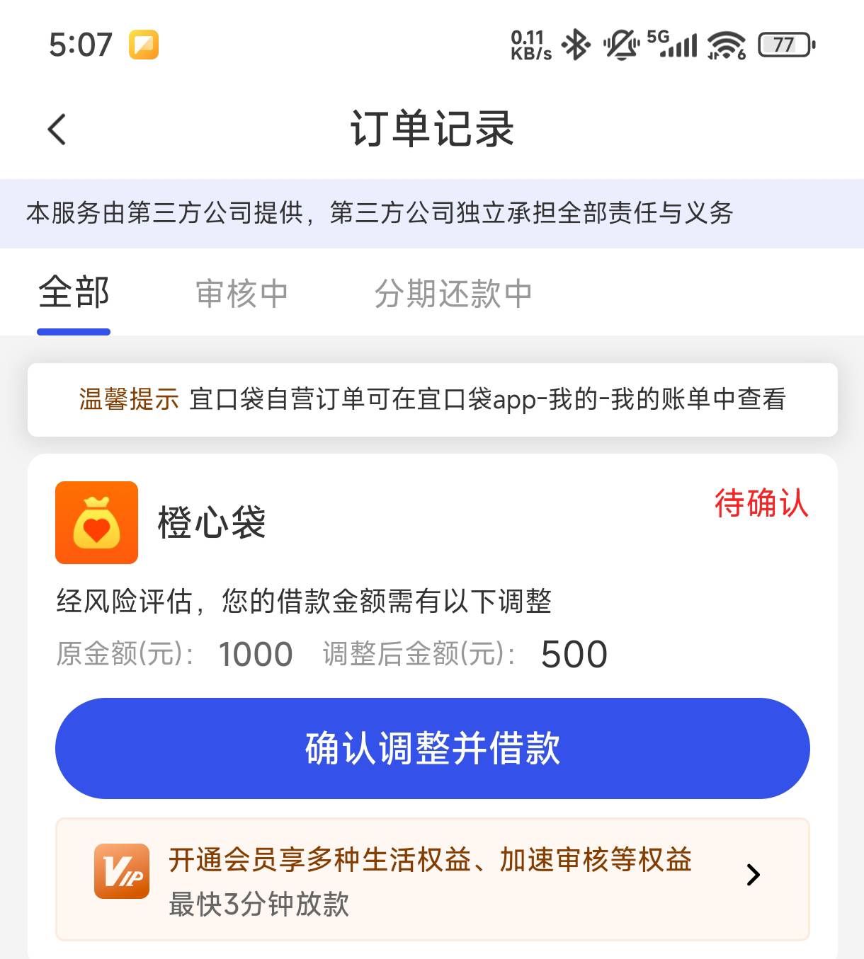 老哥们,橙心贷额度1000,发短信过来让调整额度到500,有戏吗?