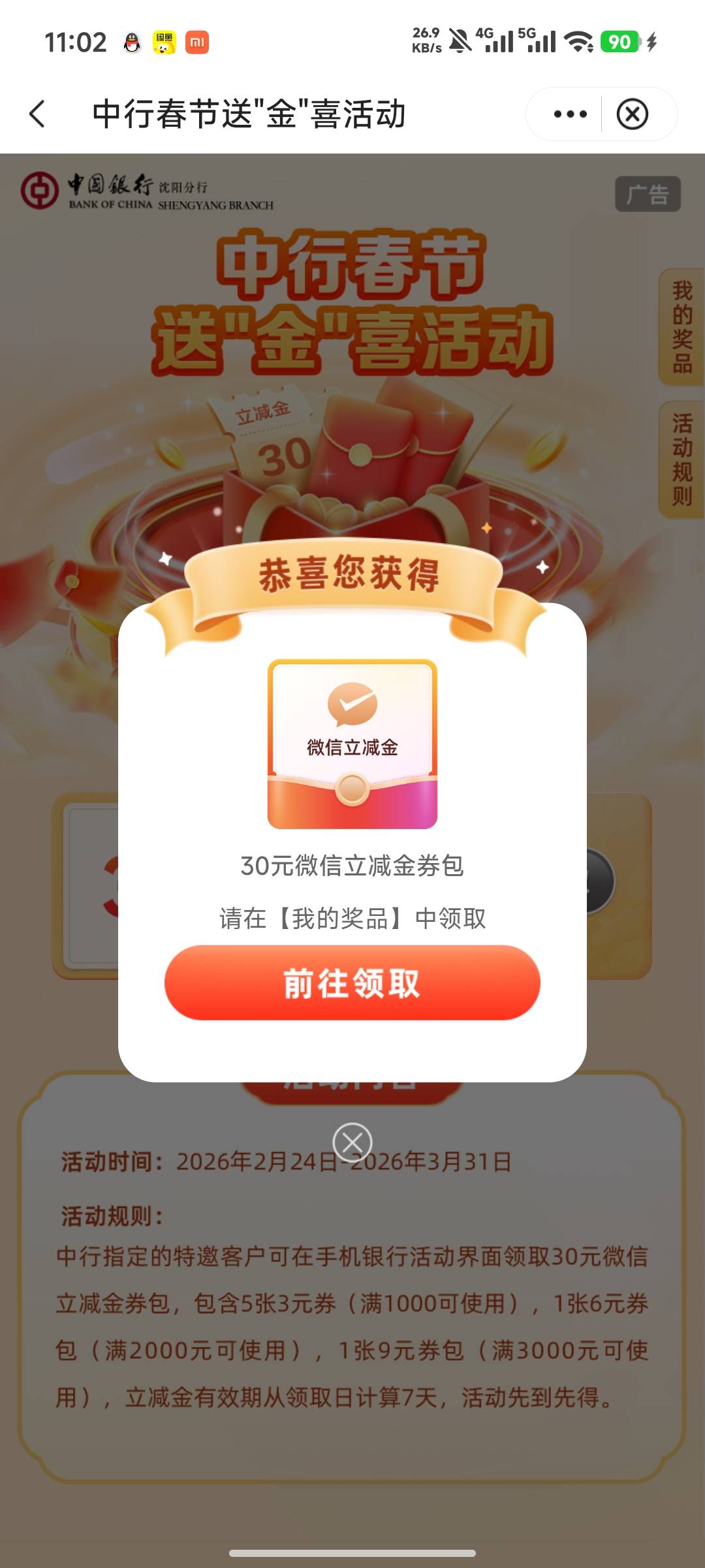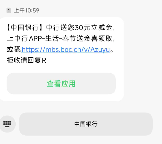 中行刚送了30立减金