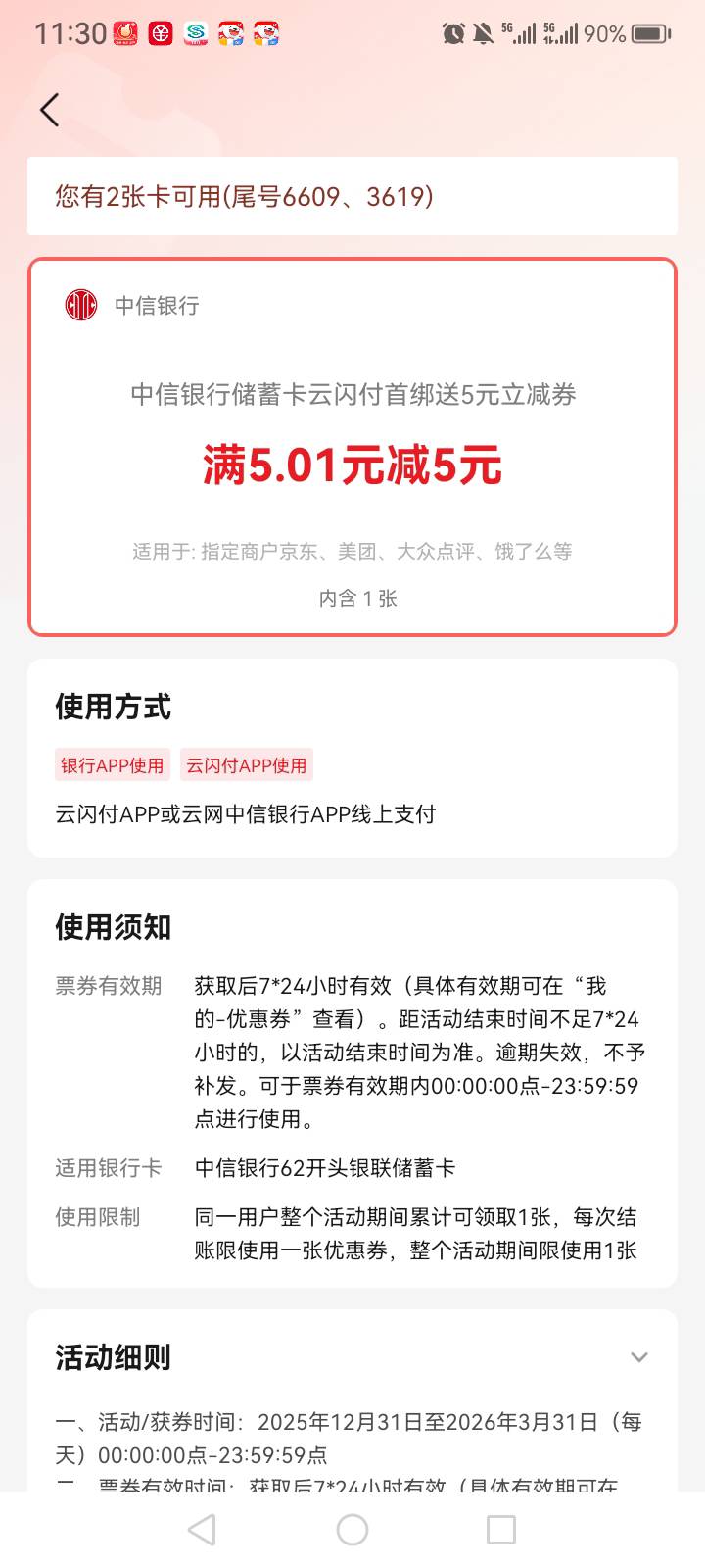 中信银行绑卡云闪付5元立减券活动