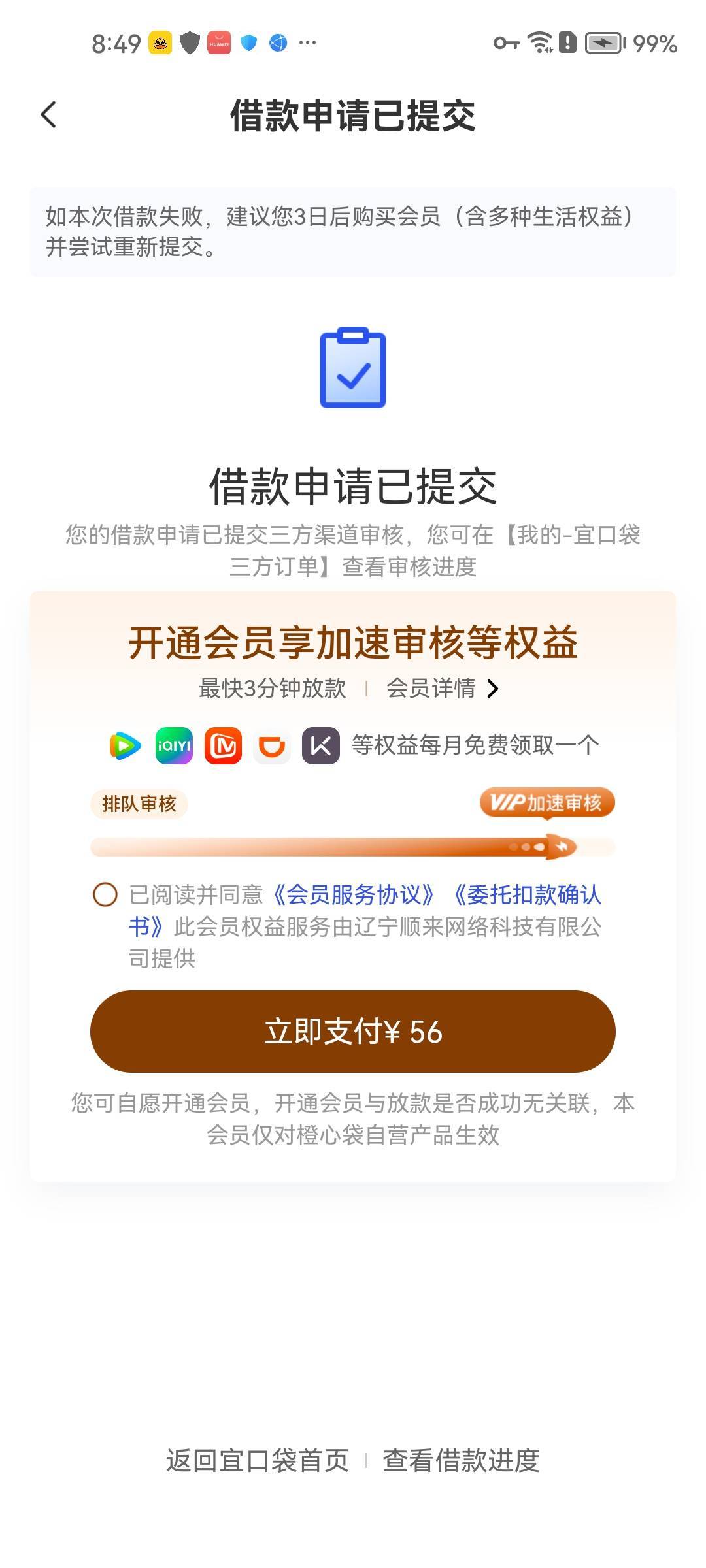 今天橙心贷第一次下款500第七天,去点可以借第二次了,但要自己支付会员56,支付完能
