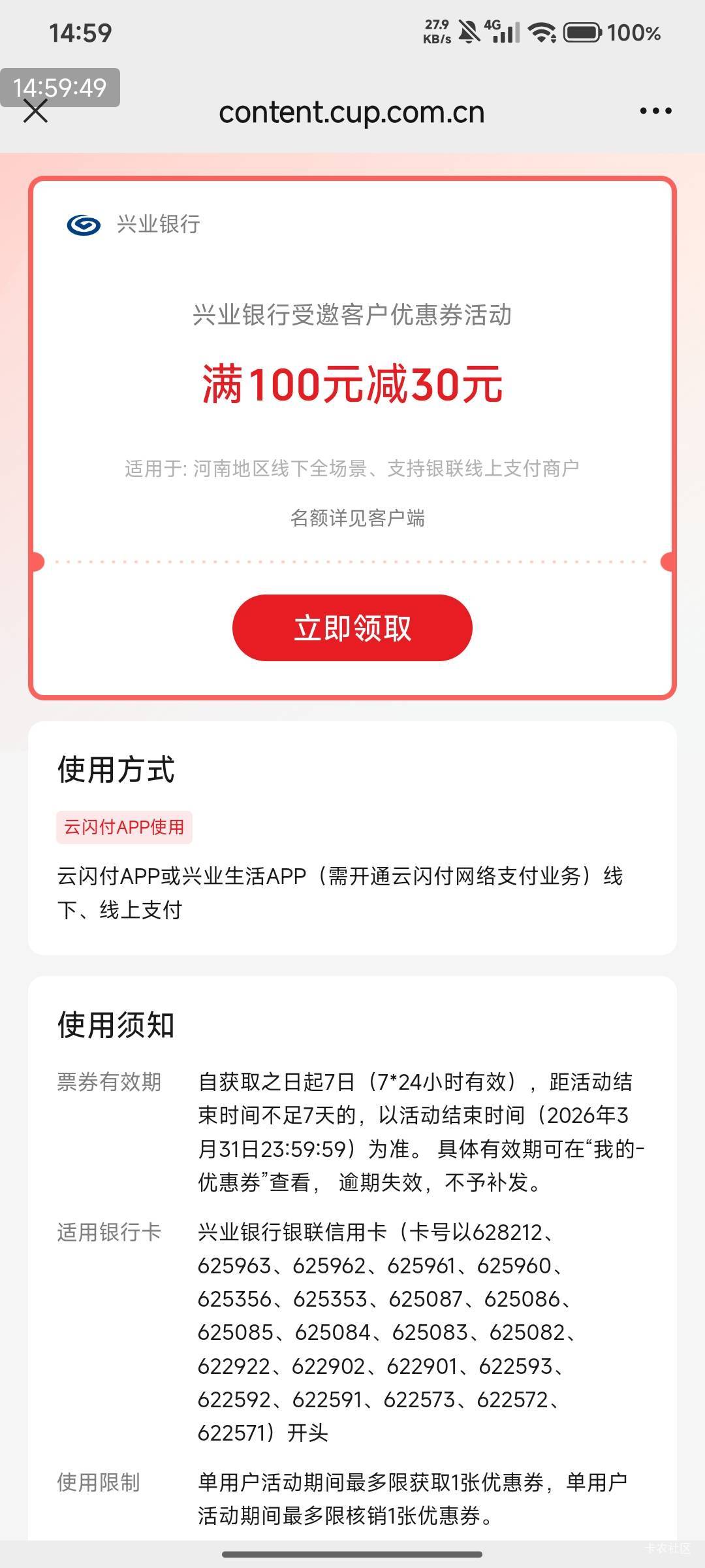 河南地区,兴业100➖30,异地别领 https://content.cup.com.cn/UCIWeb/outputWeb/cou