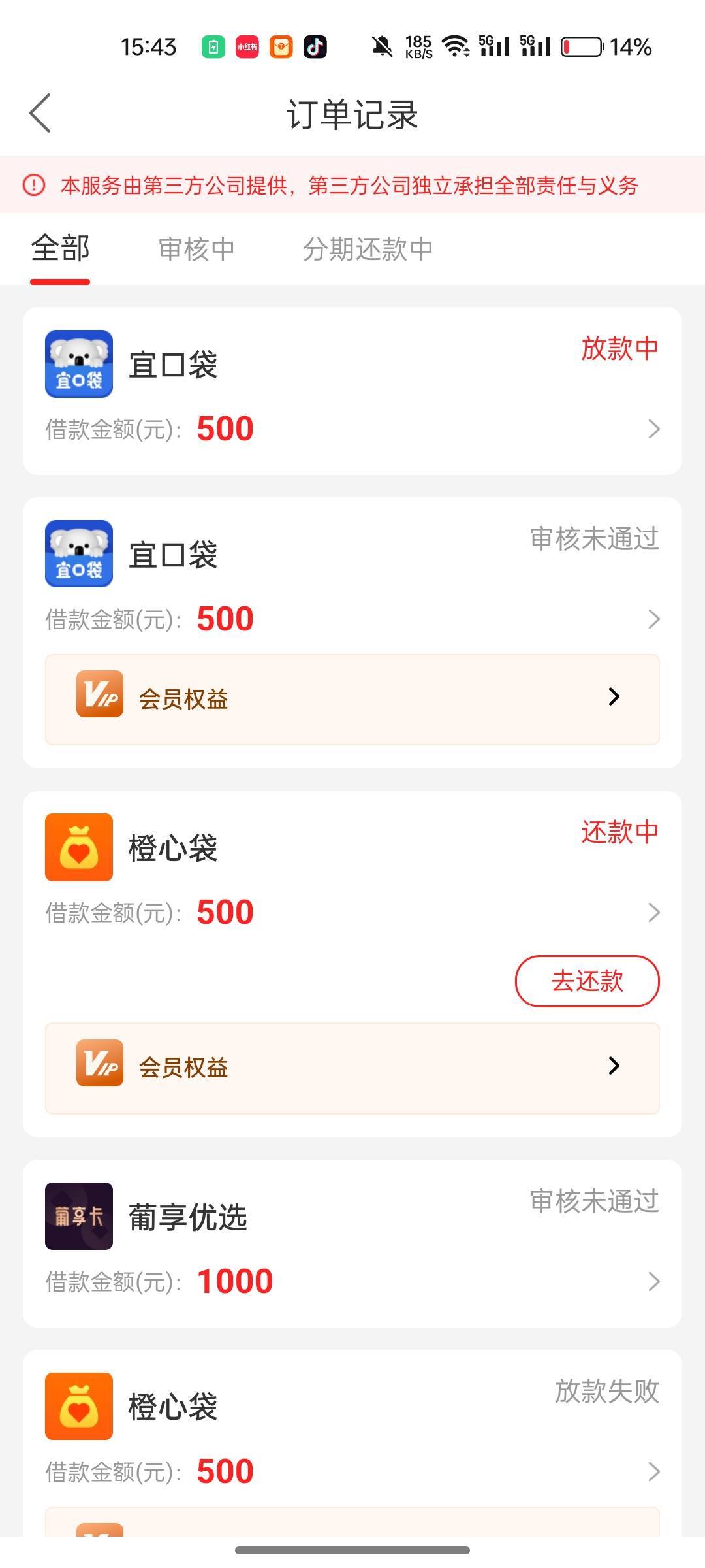橙心贷下过两次五百了,昨天下午从聚多多里申请的宜口袋2000变成500显示放款中,本体显示行方审核,点过会员先用后付了,能下吗