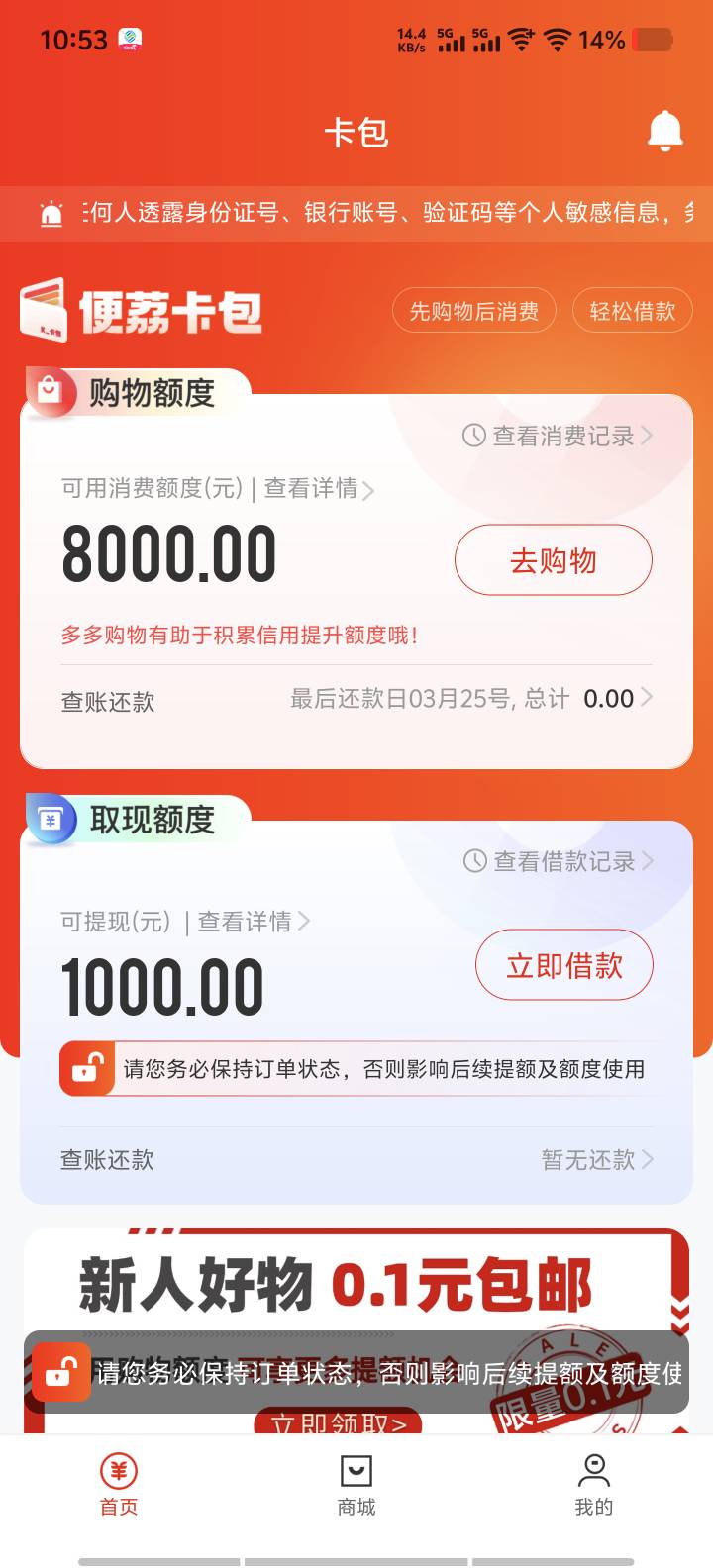 便荔卡包,没得下了,只有这个购物能用,还四千,只能到手两千三,只能分六期,要是12期还能用一下,宜口袋与我无缘了,橙心贷退过会员,现在秒拒,本体之前放款两天拒,现在直接秒拒了