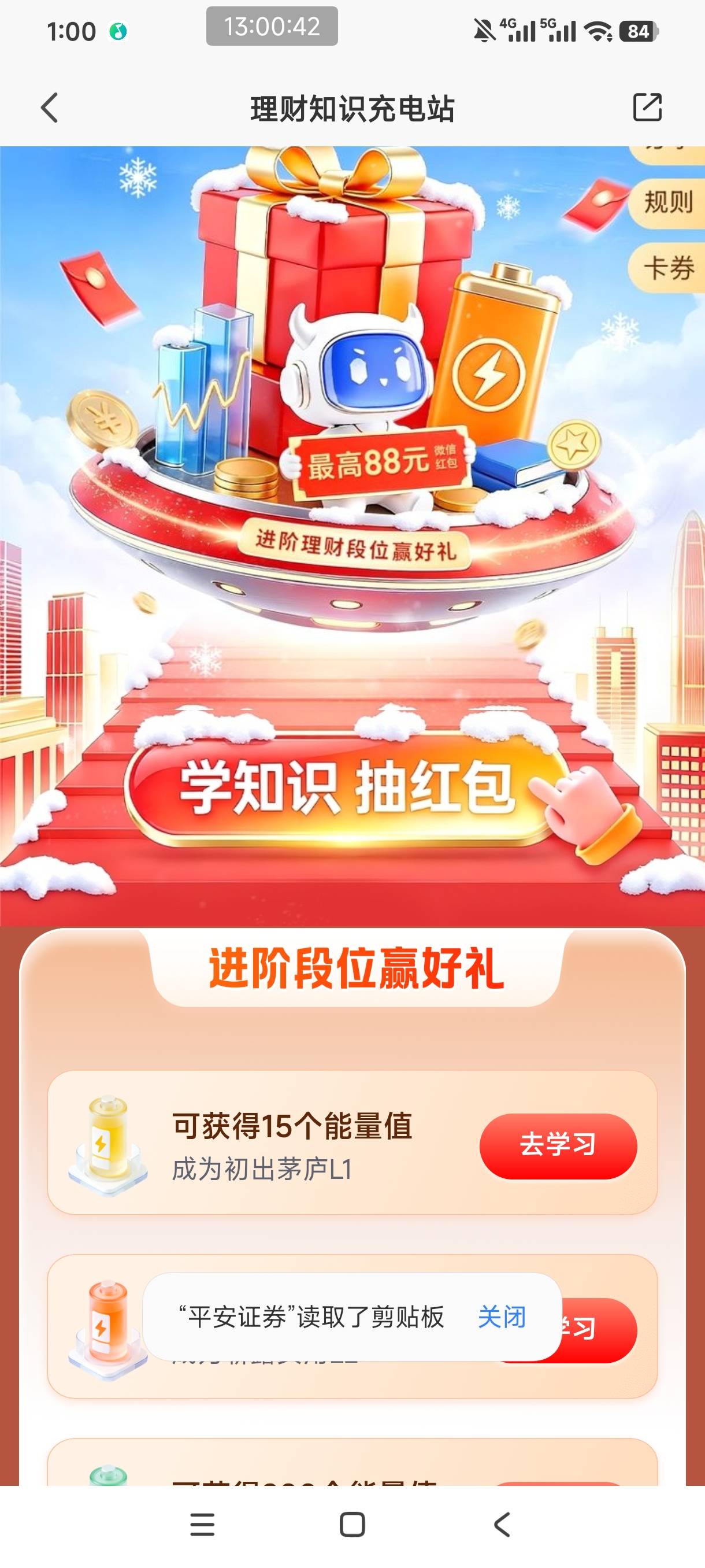 平安证券理财知识充电站抽红包活动