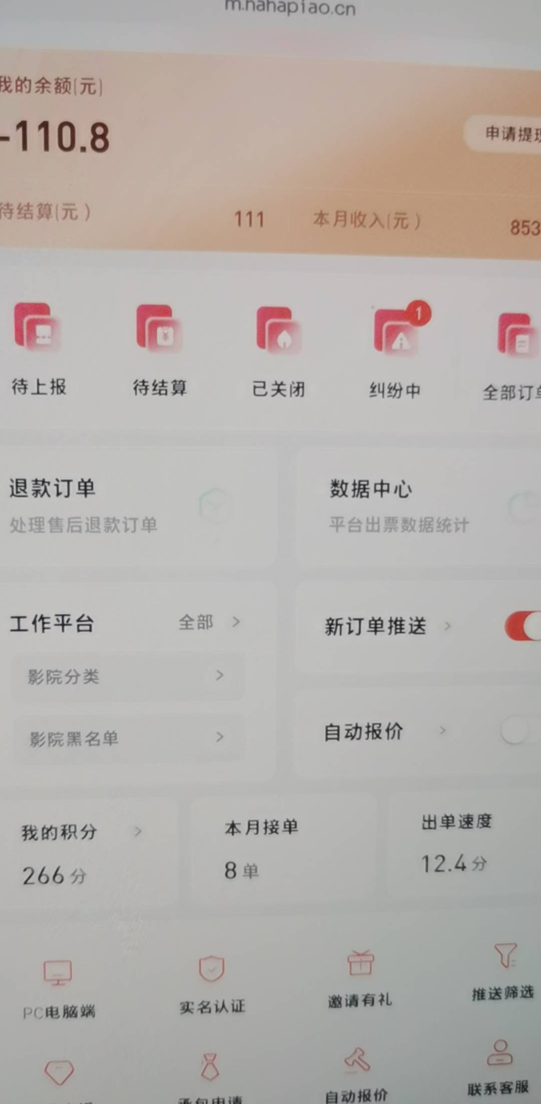 哈哈1日的两张票纠纷了,影院异常,券给我退回了,又白P110,他让我退回110,我都花了