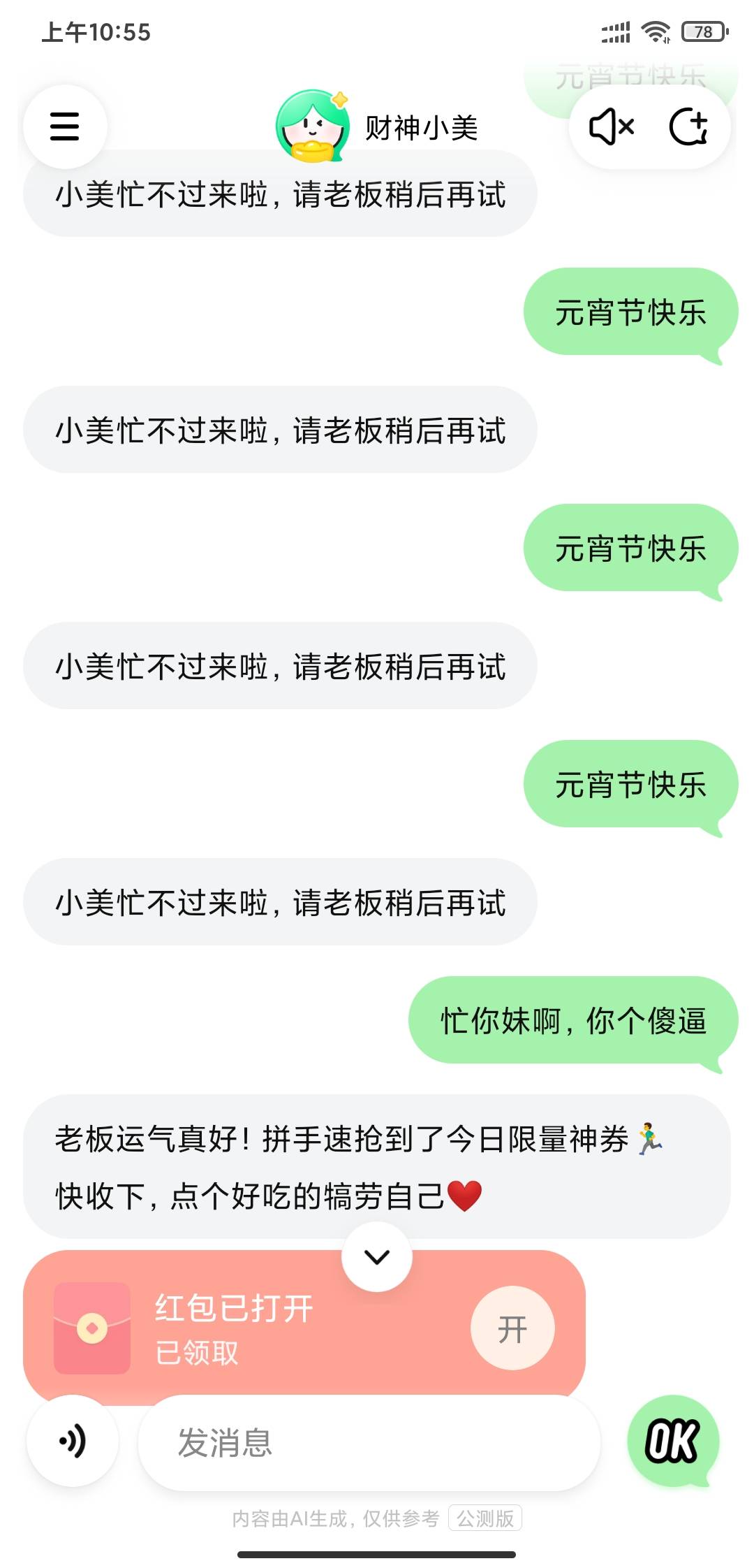 小美发了50多条,一直不出来,骂它一句马上就成功了