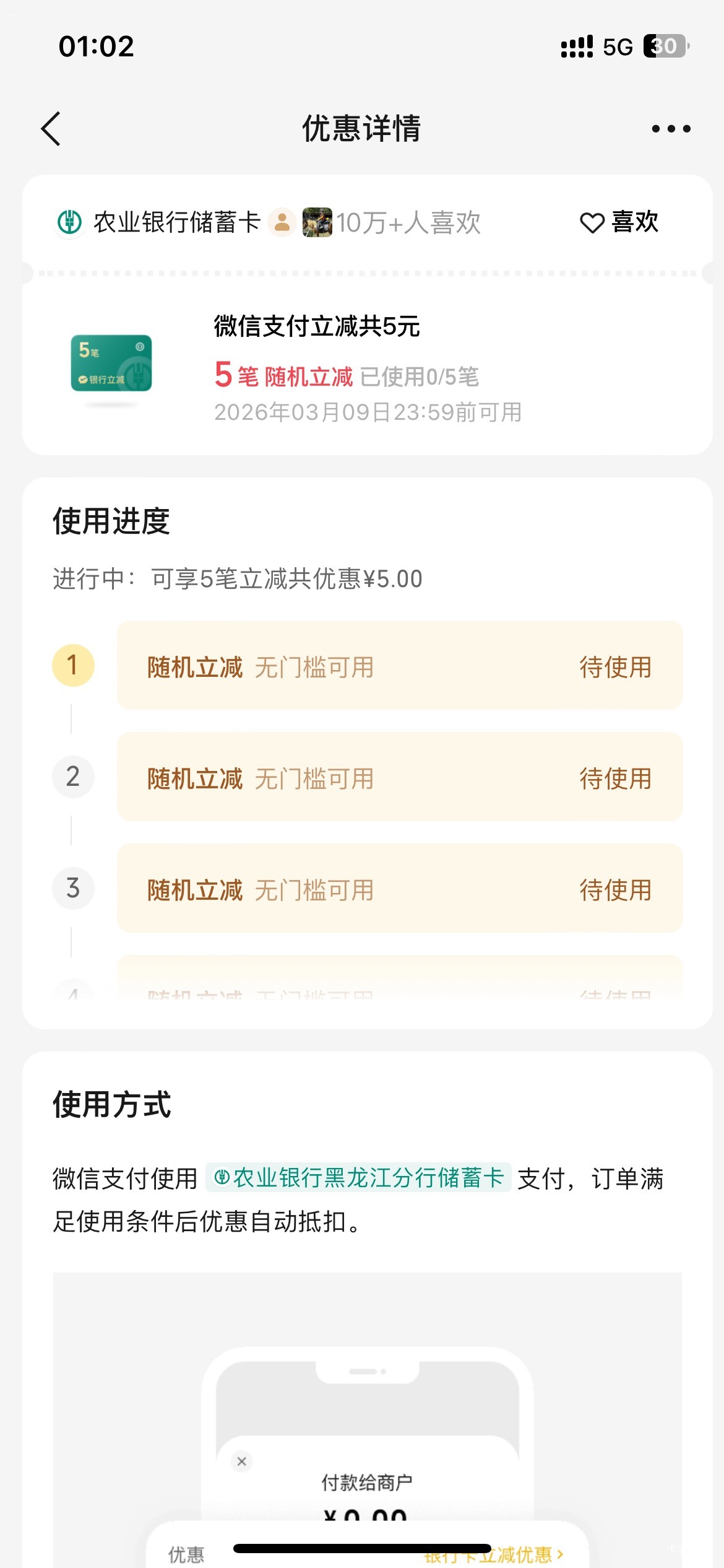 微信摇一摇农行黑龙江微信支付多笔立减活动