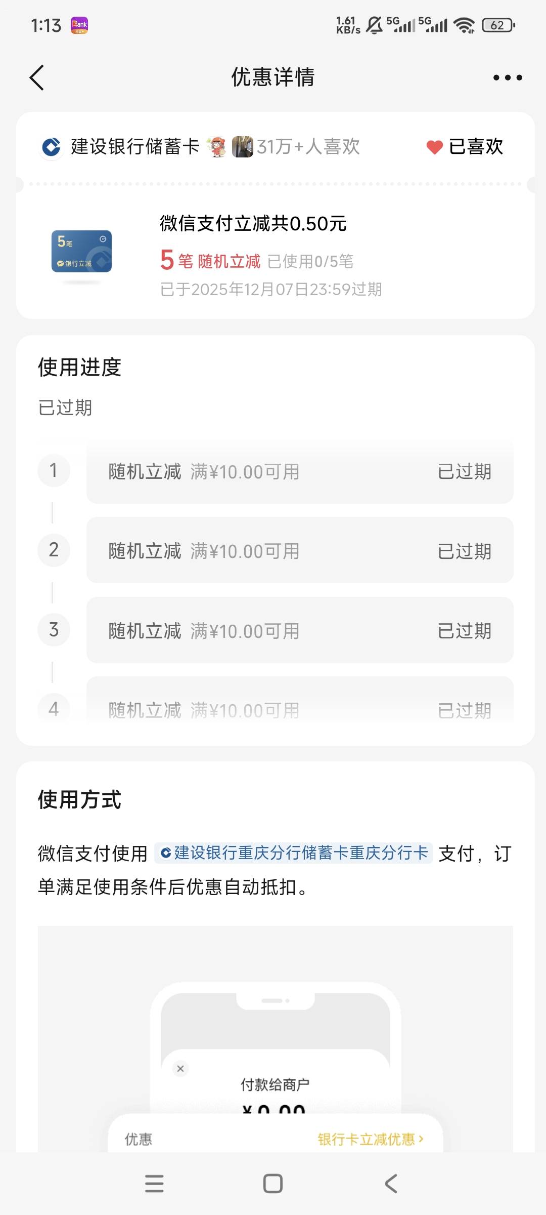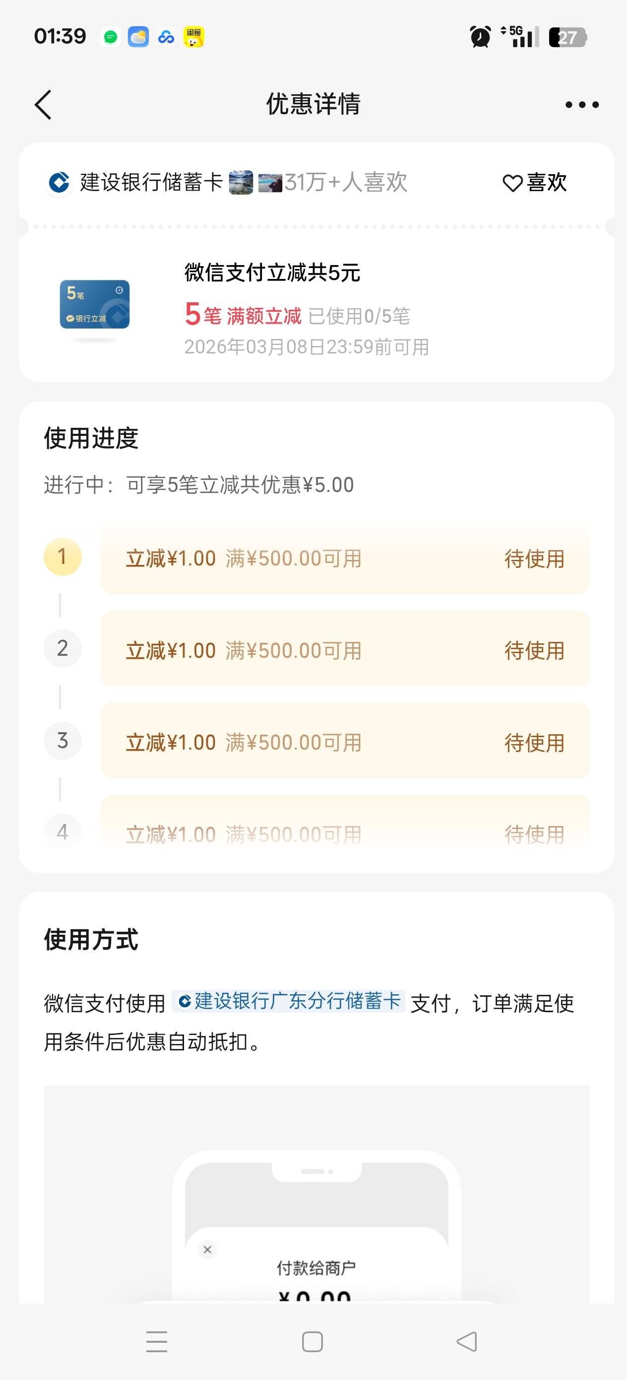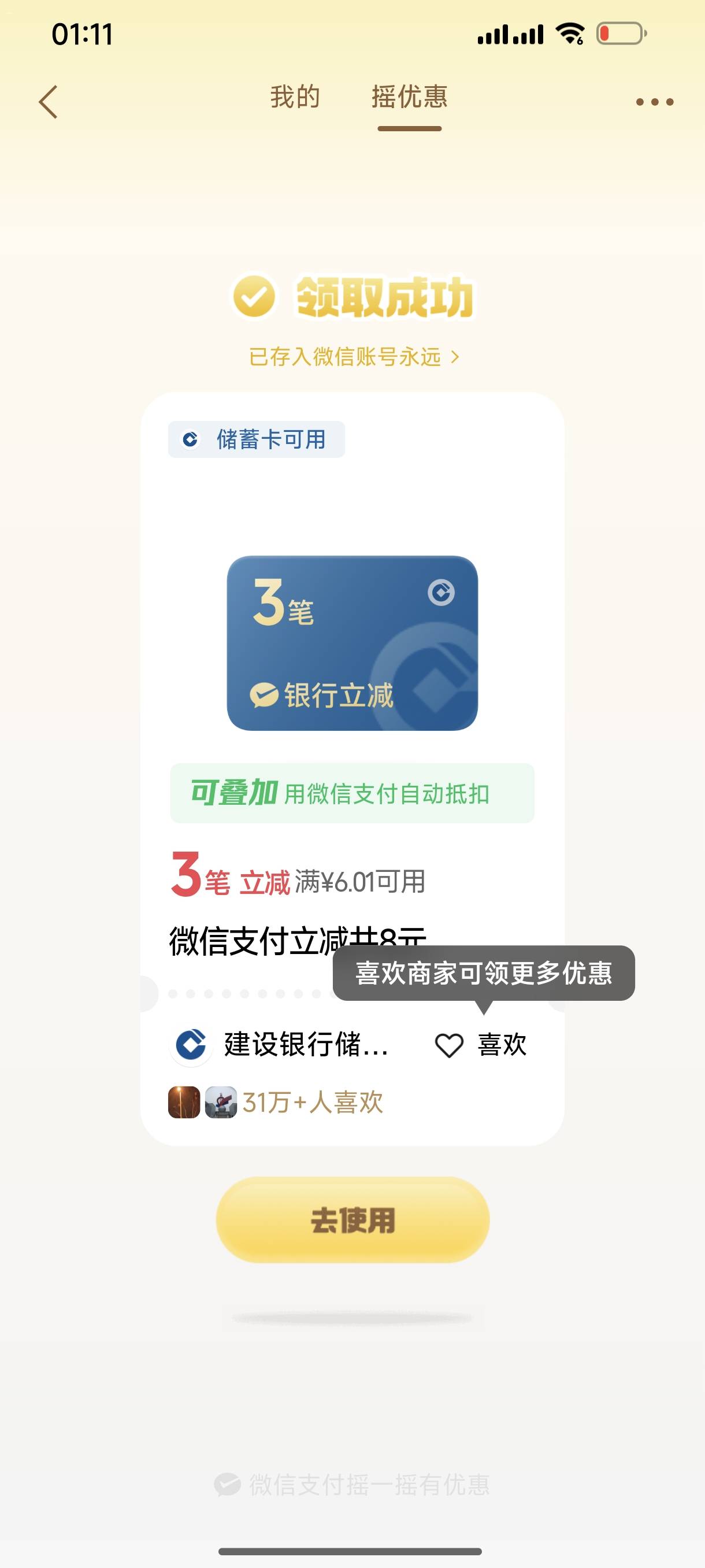 微信摇一摇建行四川微信支付多笔立减活动