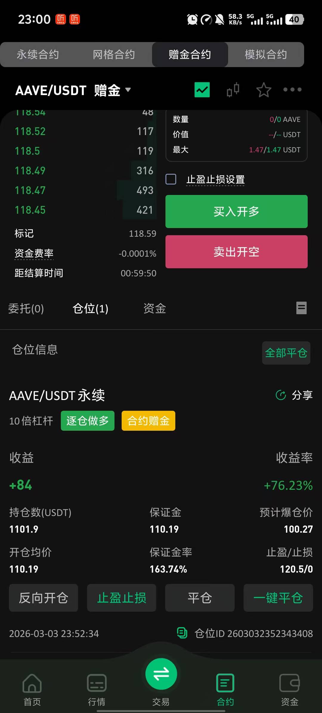 估计吃不上了,120.5才得吃,前天在110震荡,昨天在116整烫。今天估计能上,但是还有一个小时就满48小时自动平仓了,唉