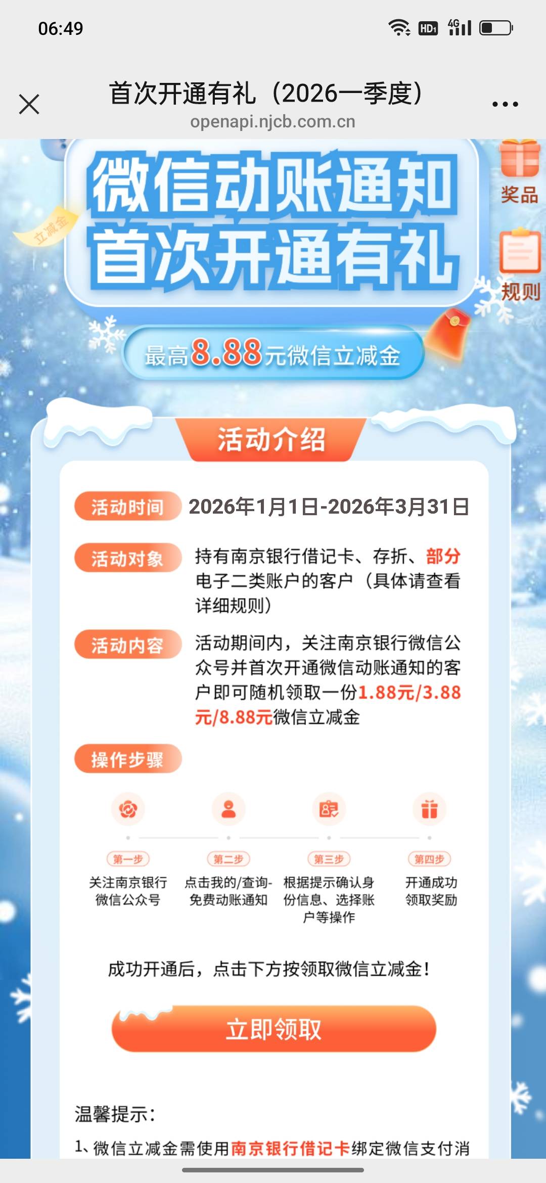 南京银行微信动账通知开通有礼活动