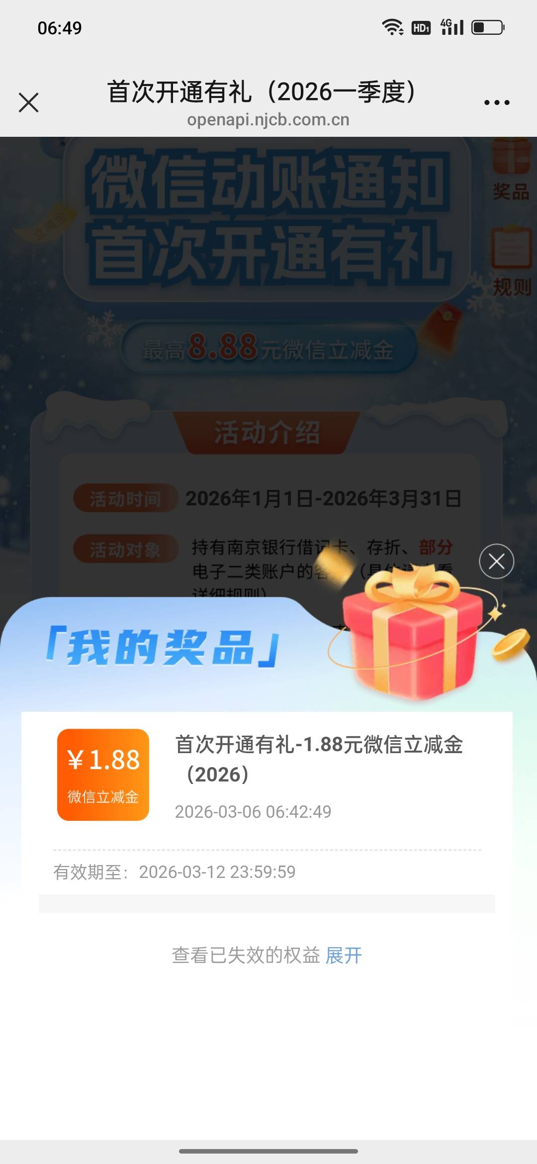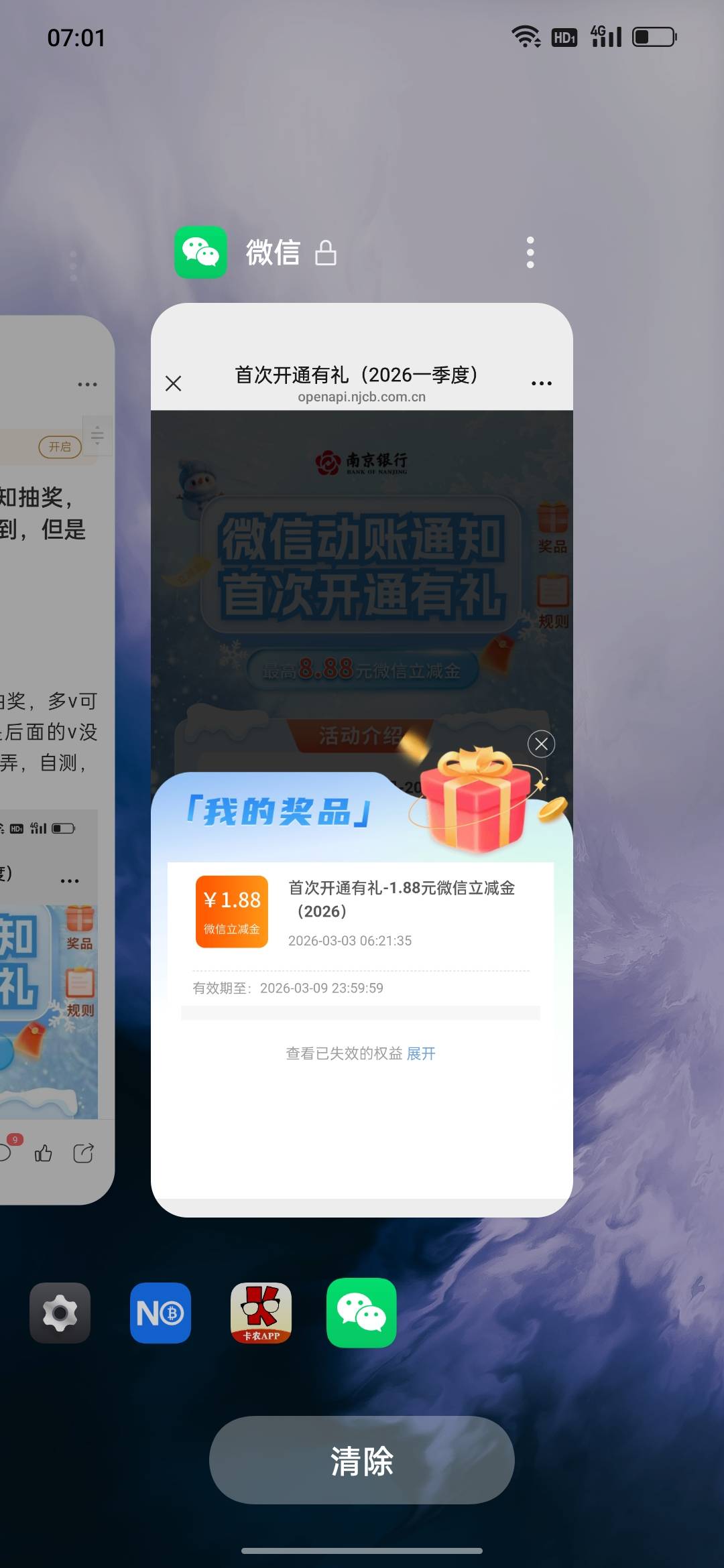 南京银行公众号微信开通通知抽奖,多v可换绑领,我多v成功领到,但是后面的v没发,可能没先绑卡,愿意弄的去弄,自测,不想麻烦的弄一个就行了。