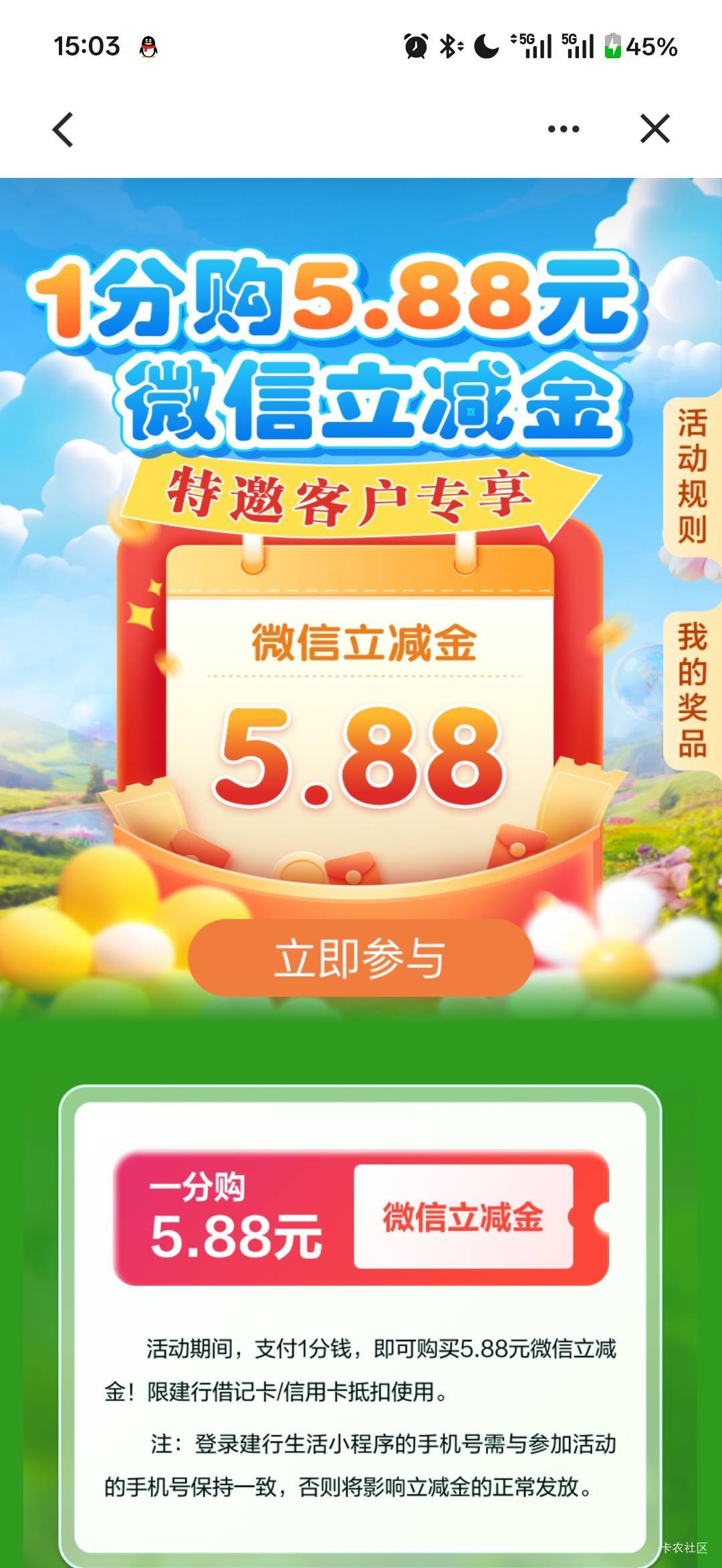 建行浙江特邀客户专享1分购5.88元微信立减金活动