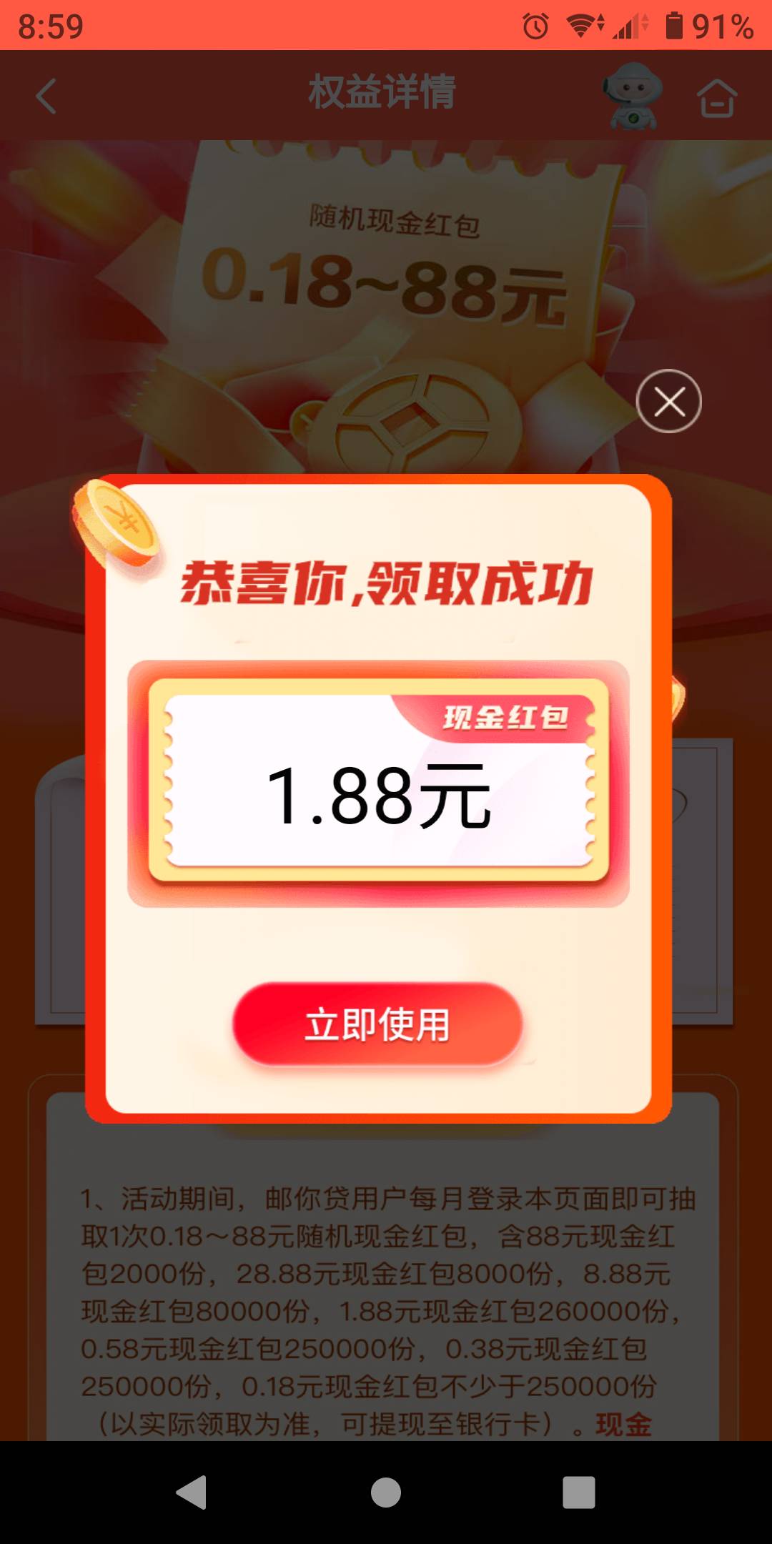 邮储权益专区邮你贷月月领现金红包活动