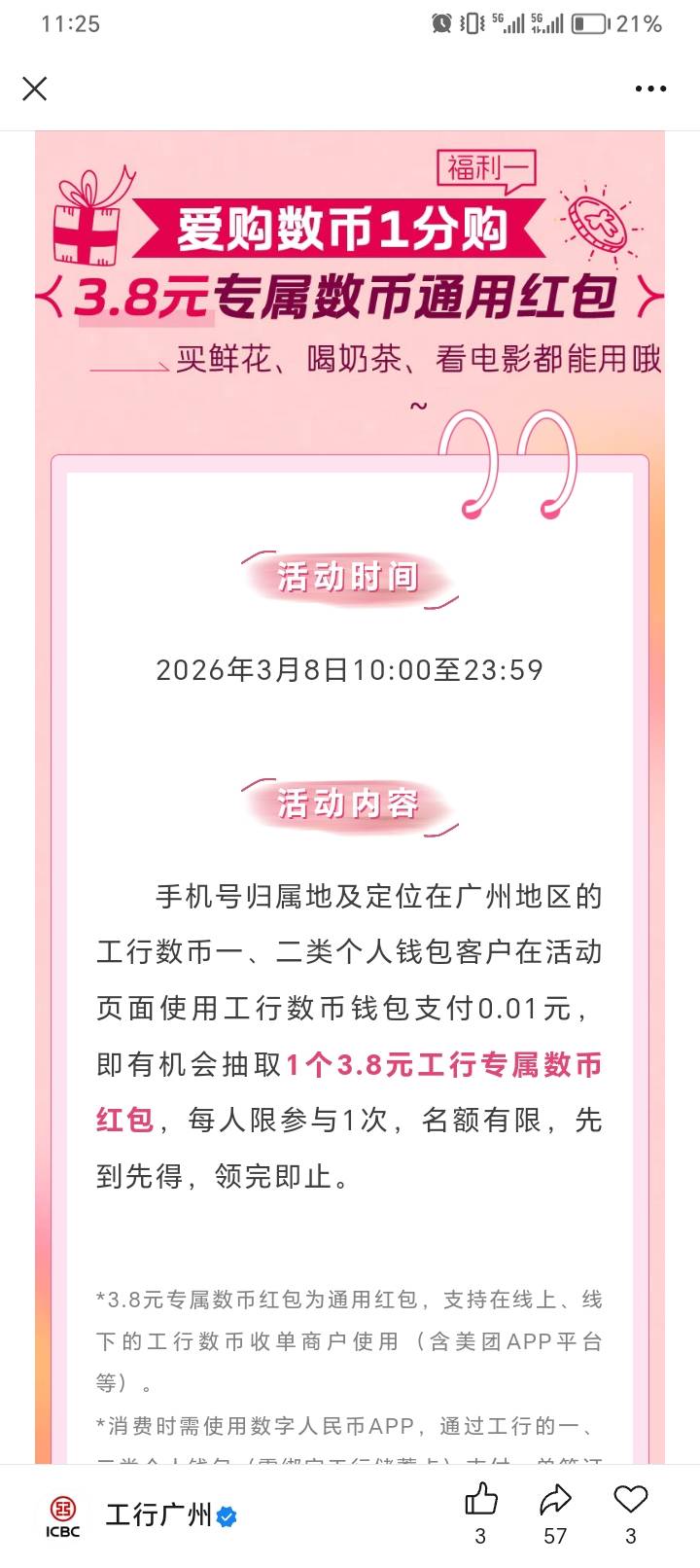 3月8号10点工银e生活爱购数币1分购3.8元通用红包