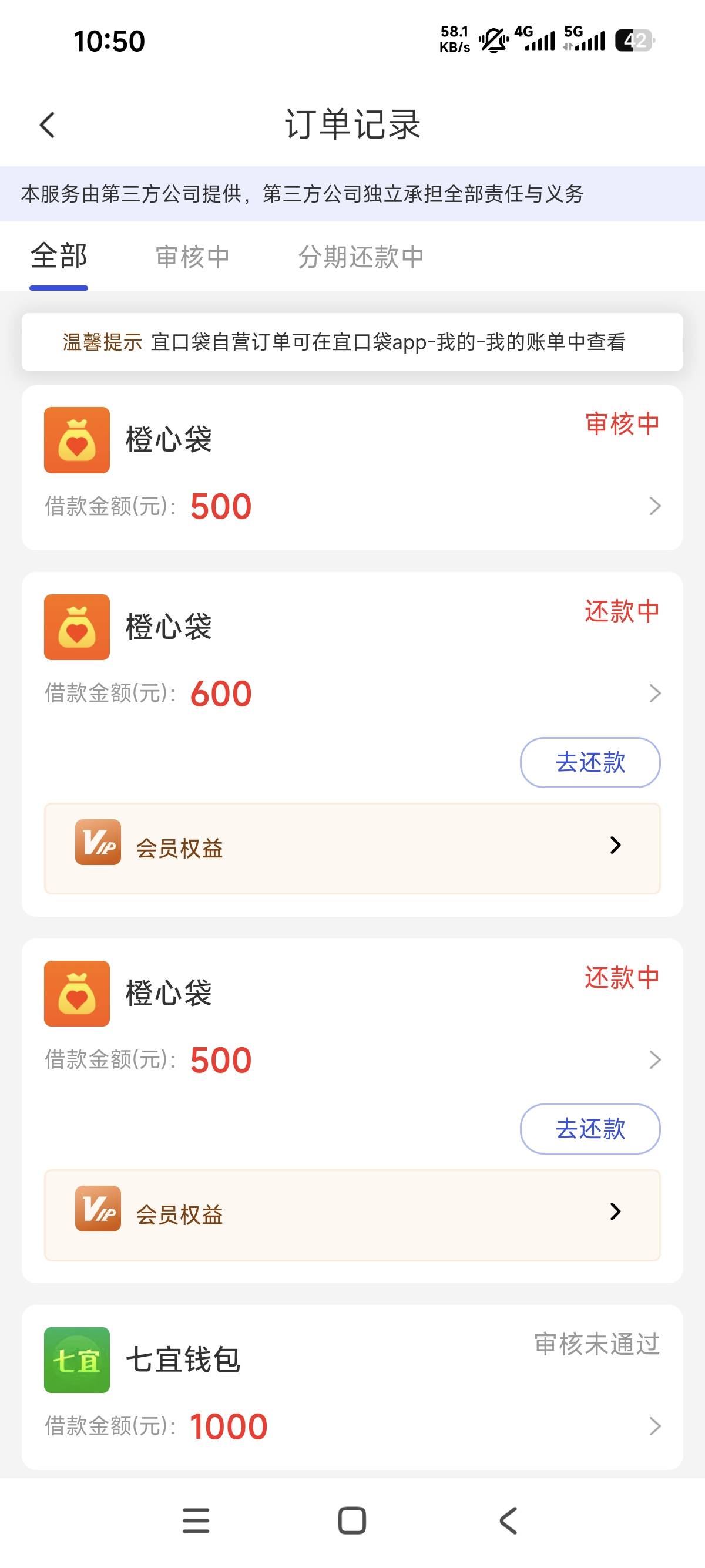 橙心贷突然一天连下两笔,睡醒看到又有第三笔。不知道还能不能下。暂时没出开通会员。加上1日的宜口袋本体第四笔了