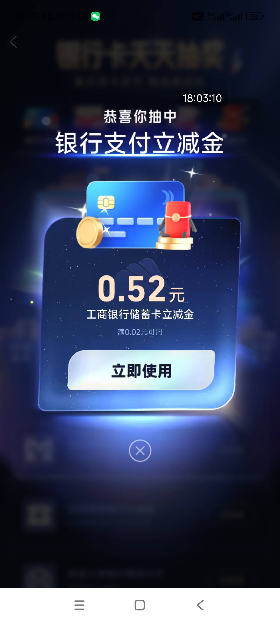 支付宝YHK消费抽1.5三包小辣条到手。