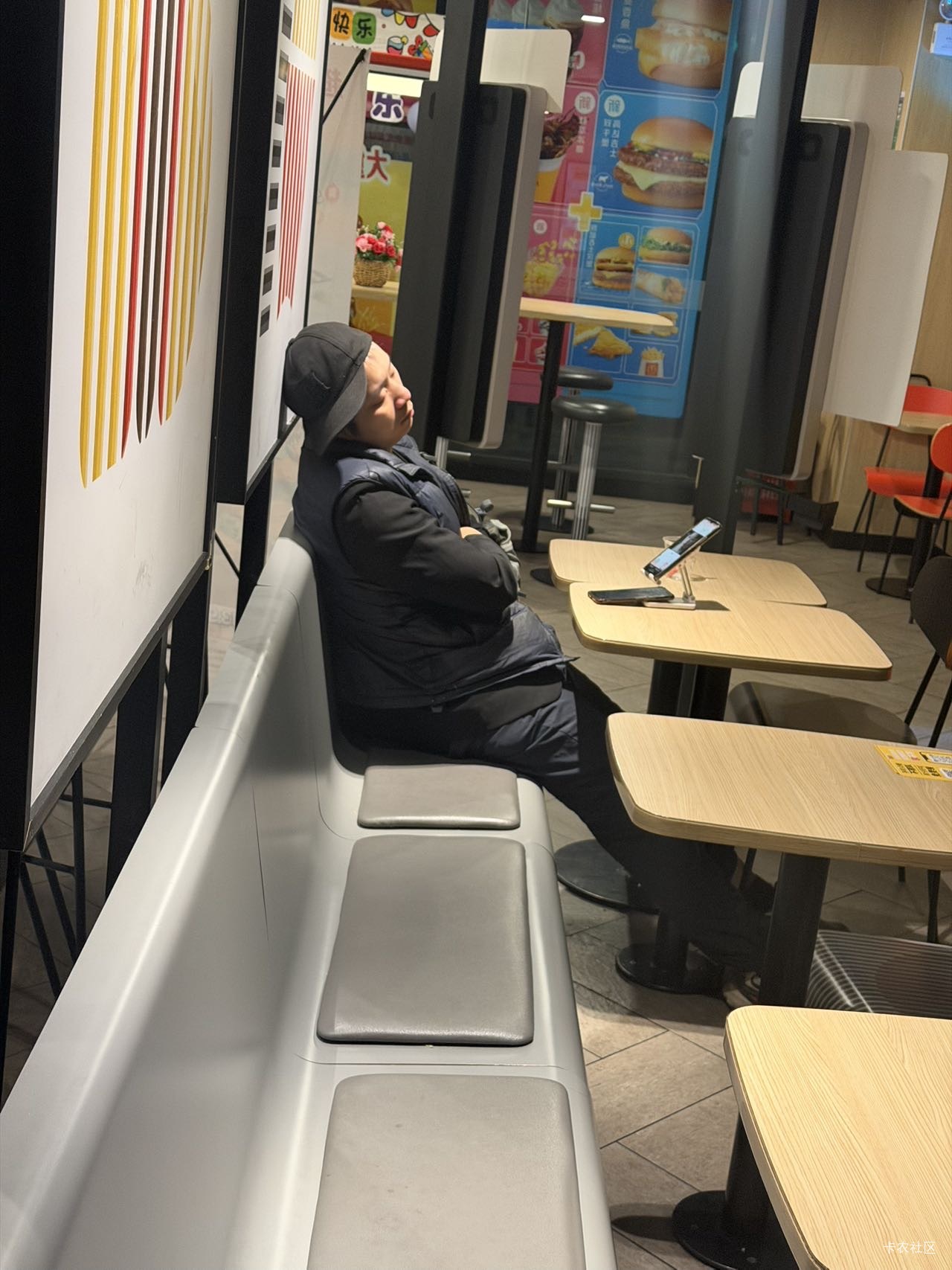 这是哪个老哥在我管理的这家餐厅一躺就是半年了,每晚凌晨一点左右来到早上七八点就走,有时候放杯蜜雪冰城喝去旁边的盒马买一袋面包啃,都没在我餐厅消费过但是也没赶他,只要不影响他人就餐不吵闹就行