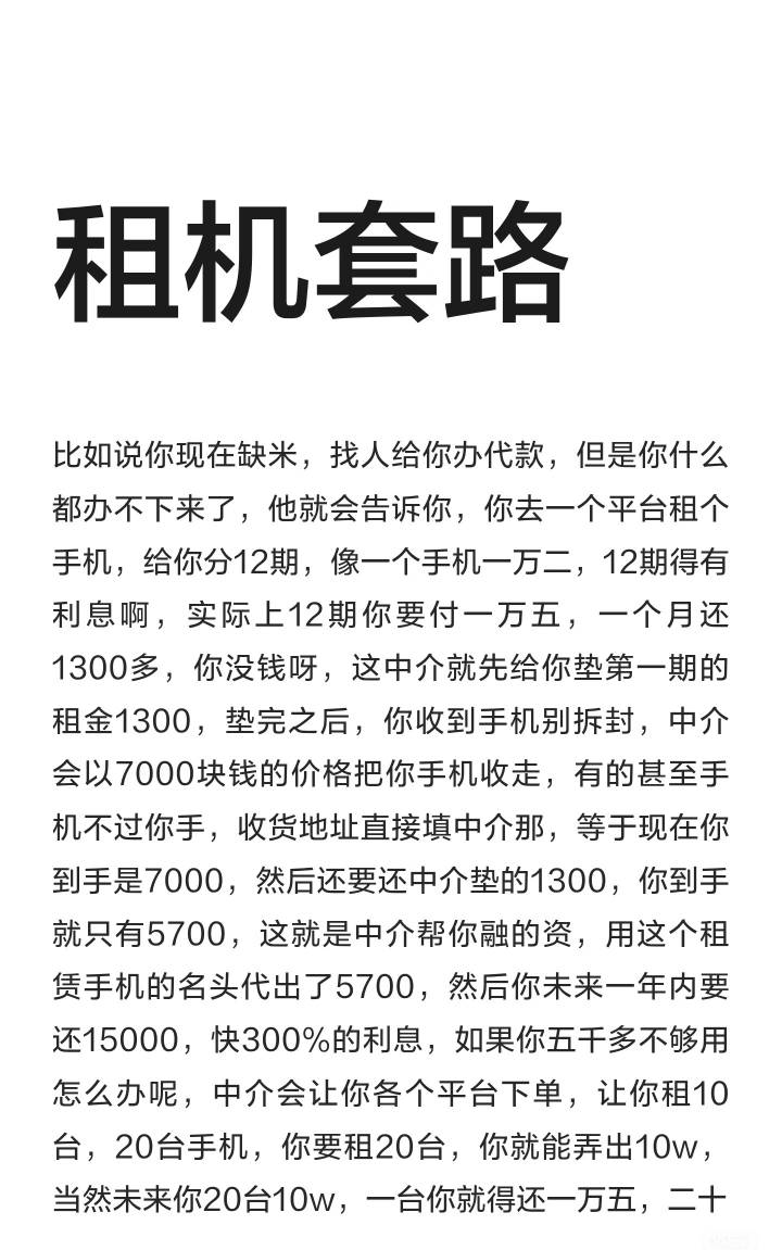 七旬老太手抖 发表于 2026-03-10 17:09 目的不是要手机,要的是你的高额利息和费用。大概意思你花一万五贷款买的手机,他七千回收。七千还扣除两千费用,你到手五千。一万五是你要还的