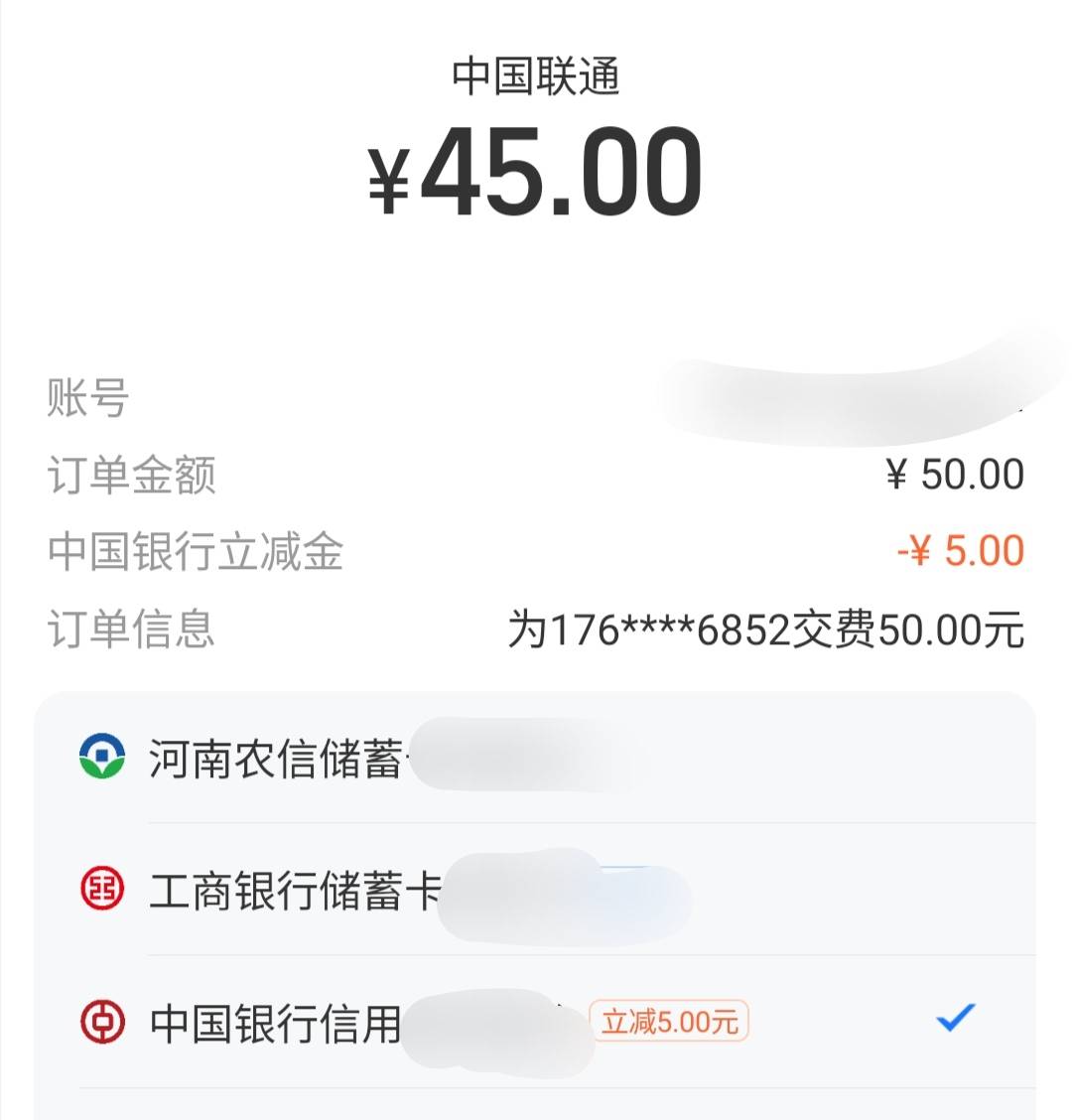 支付宝交话费中行信用卡好像有立减,老哥们试试