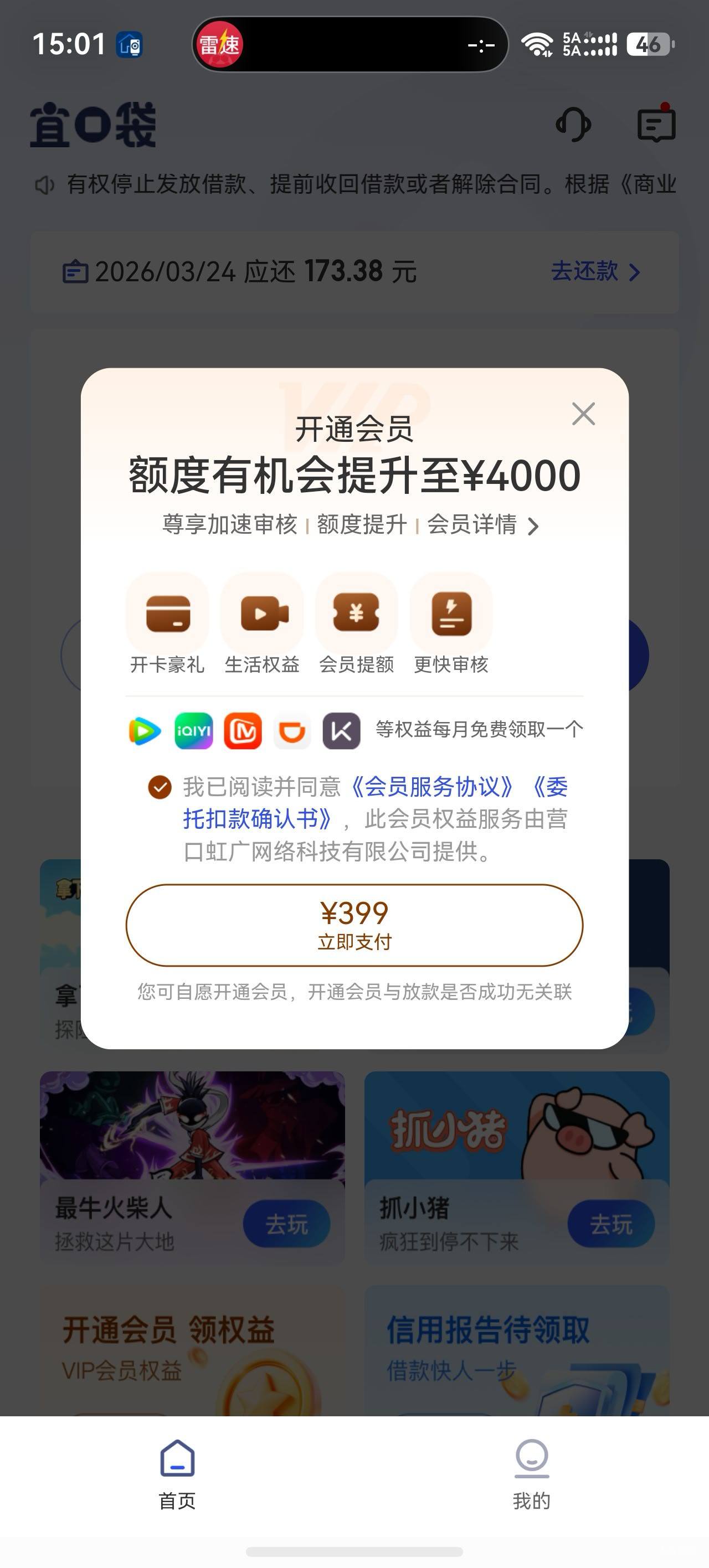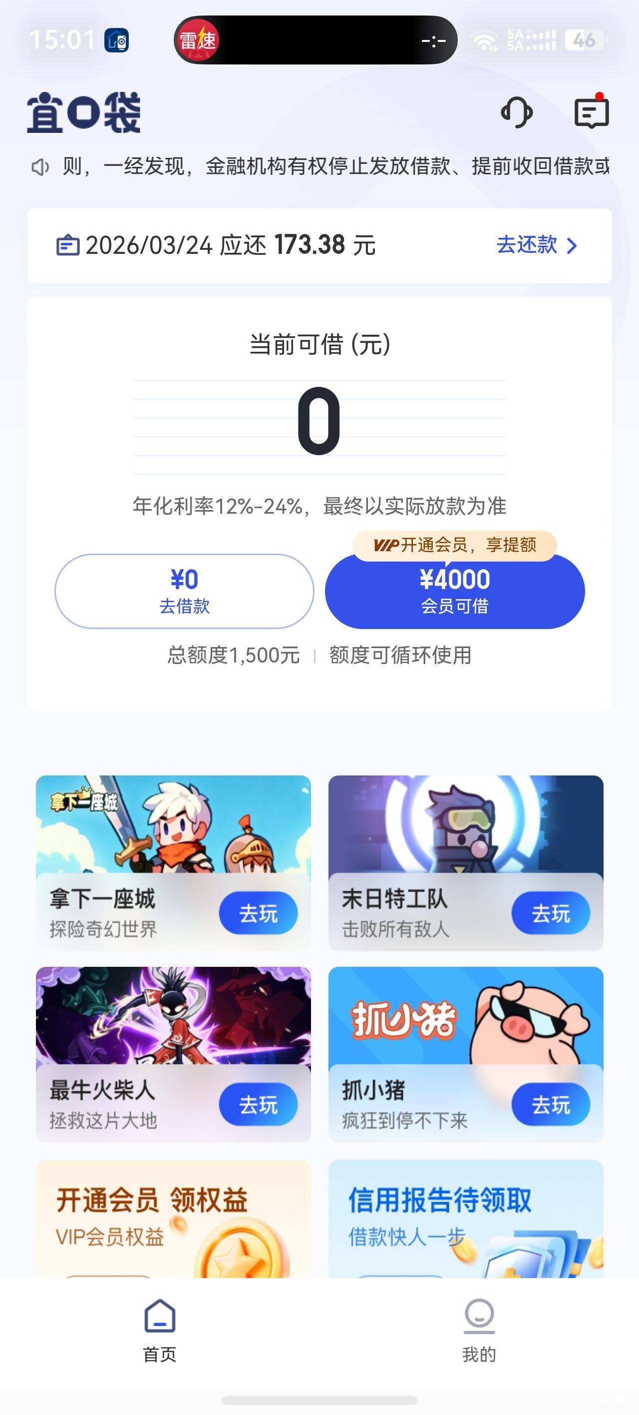 宜口袋没有额度好几天,找客服反馈了一下,一开始一元开通会员给了4000临时额度,秒拒又收到短信变500 秒到账  现在还有399变4000