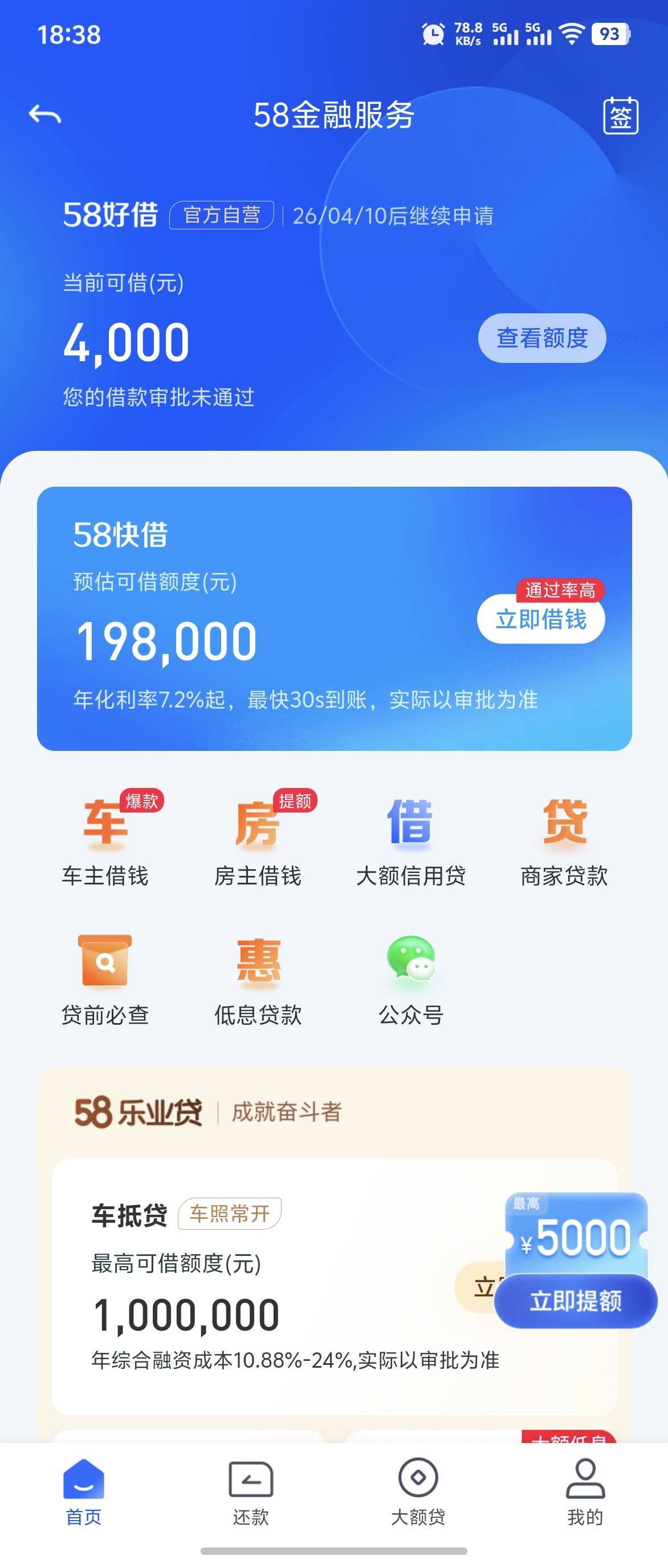 看到有58下款的。去试了下,第一次有额度。4000,点击放款就失败。不注意还给我开了个