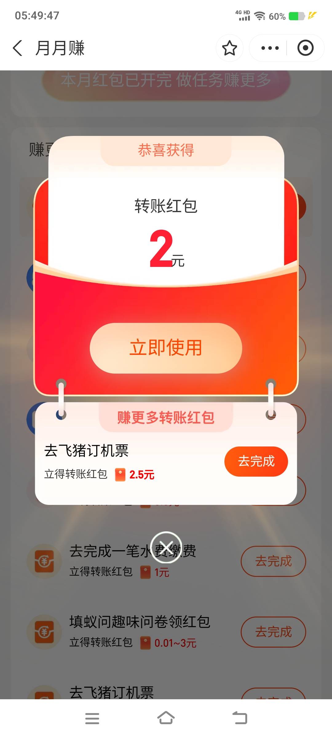 支付宝月月赚完成任务得转账红包活动