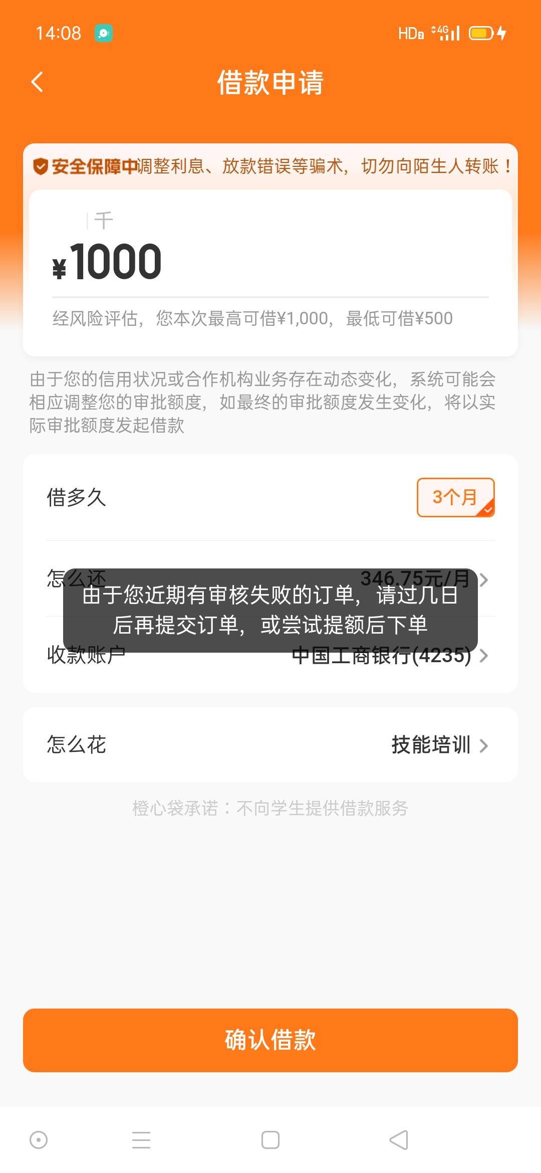 各位老哥橙心袋本体申请1000变500 先用后付 还是拒了 怎么办 还能过吗