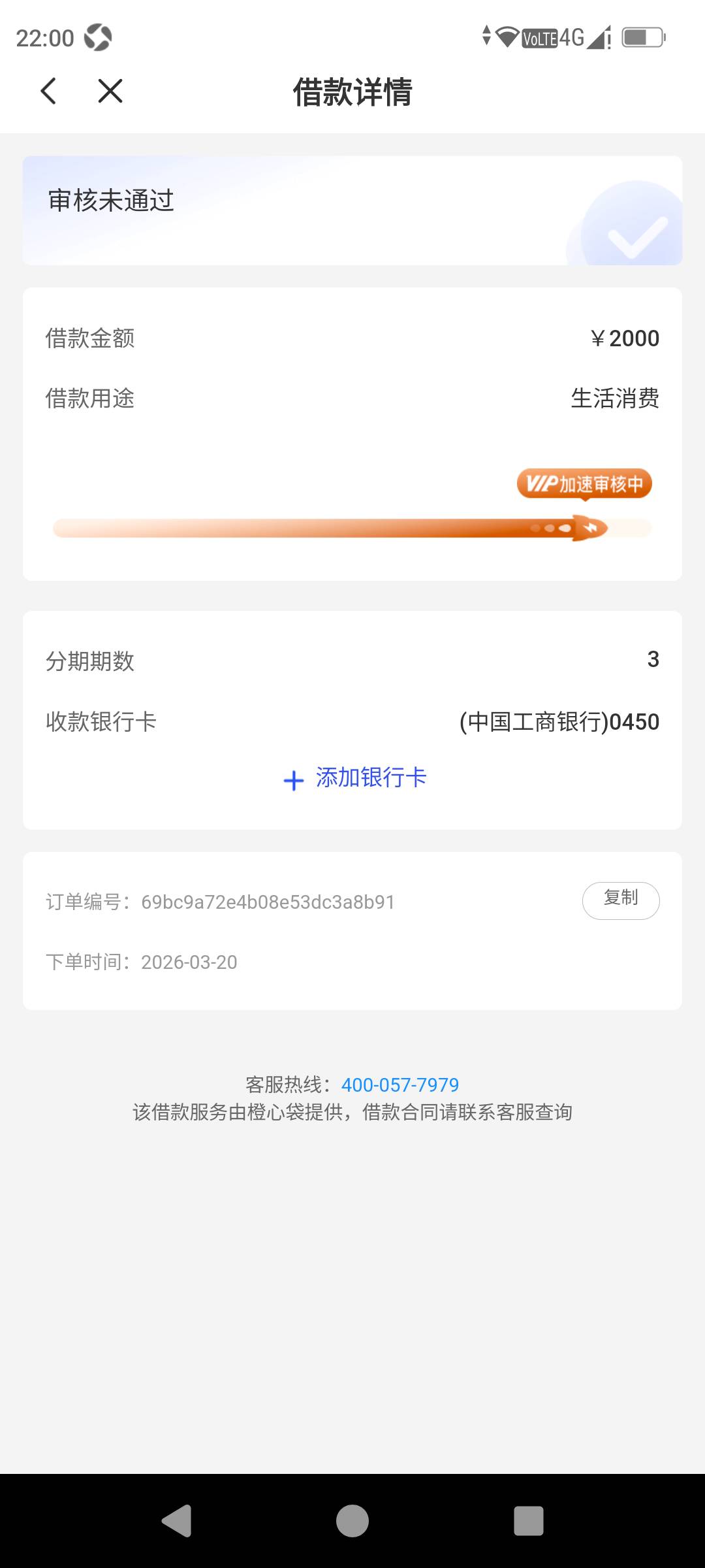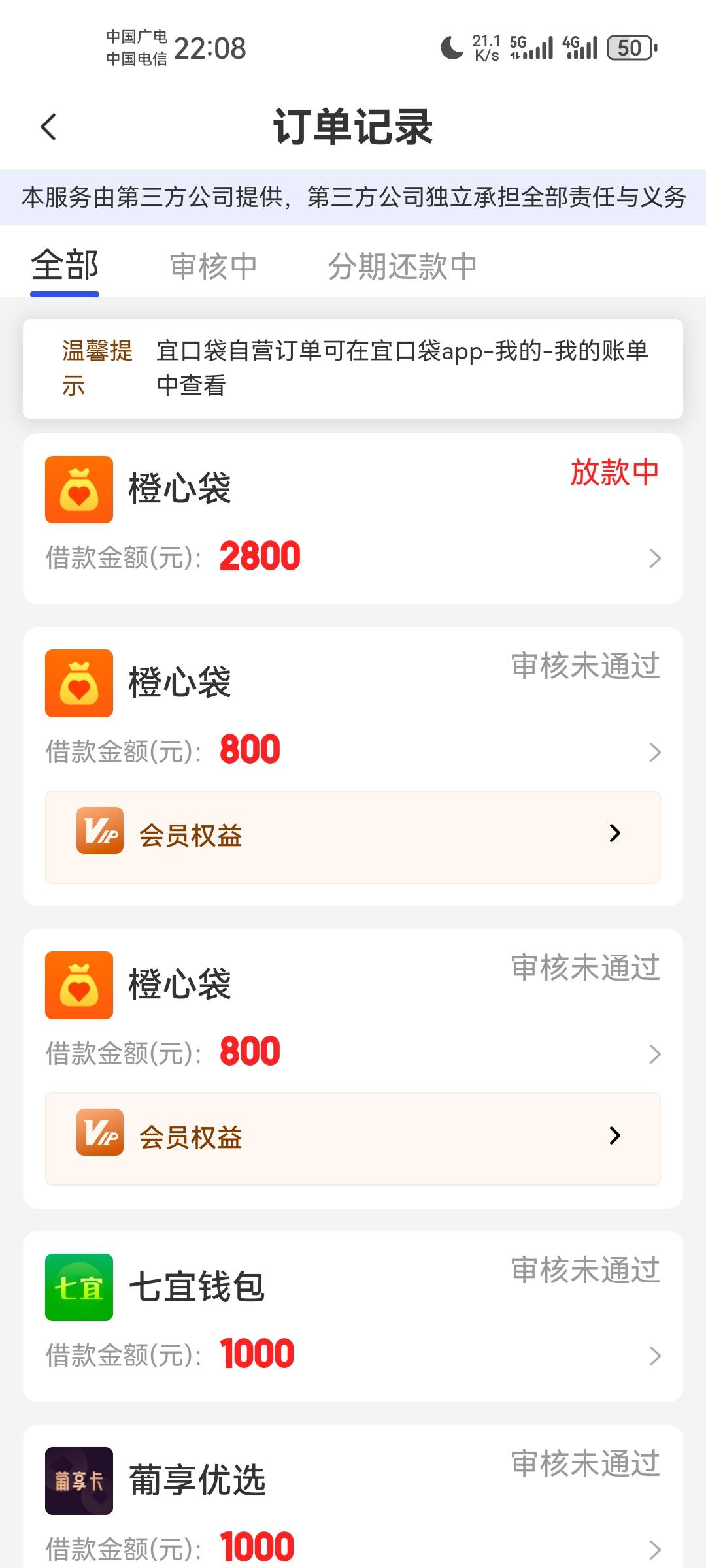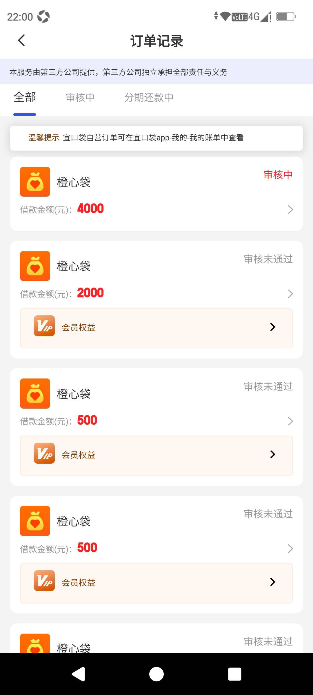 咨询一下各位老哥刚刚宜口袋里橙心花支付199会员卡申请2000没通过,紧接着4000申请就出现等待审核放款状态,并且支付的会员费用也没有马上退回我的YHK里,就是想问问各位老哥这种情况你们遇到过没有能否真正下款